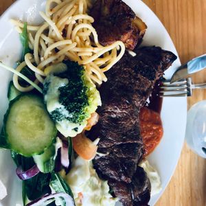 ランチは牛ステーキと鶏の照り焼きから選べるビュッフェスタイルでした。個人的にはアンガス牛のステーキを塩で頂くのがオススメです。とても美味しく大満足。子供はフルーツをたくさん食べてました。