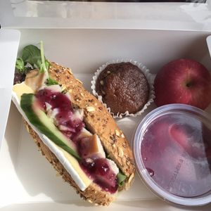 軽食には、サンドイッチやデザートの他に水やリンゴが付いている。