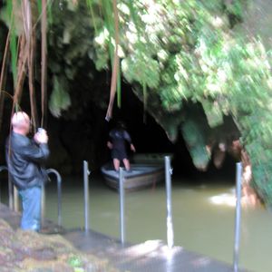 宿泊先でピックアップということでしたが、いきなり迎えの人が20分の遅刻。。 遅れを取り戻そうと、スピードは出すは運転は荒いし。。そんな感じでいきなり印象が悪くスタートしたこのツアーですが、ほぼ定刻で最初の目的地ワイトモに到着。マオリの人の案内で鍾乳洞に入ってボートに乗り込むと満点の星空のような青白い光が、とても幻想的でした。