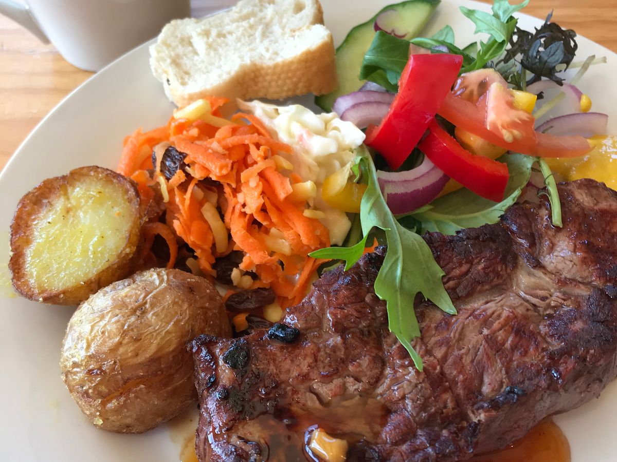 昼食の肉厚ステーキとビュッフェも良かった。