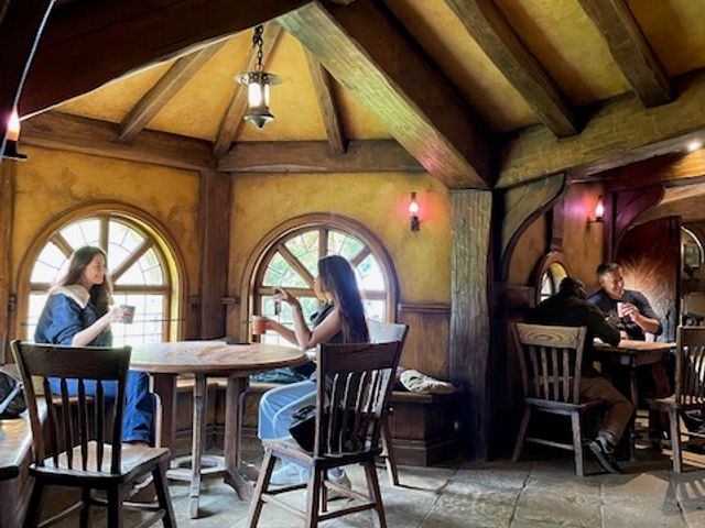 ワイトモからさらにバスで2時間ほどでホビット村に到着。最初にトイレ休憩とお土産屋さんを見てそのあとツアーバスに戻りホビット村に向かいました。村の中はロードオブザリングの世界そのままでファンにはたまらないと思います。実際、ツアーに来ている方はガチファンも多く1人参加でも写真を取り合いっこしながら楽しく回ることができました。最後はグリーンドラゴンで1人1杯ドリンクをいただけ、さらにお土産にマグカップまでもらえました。
