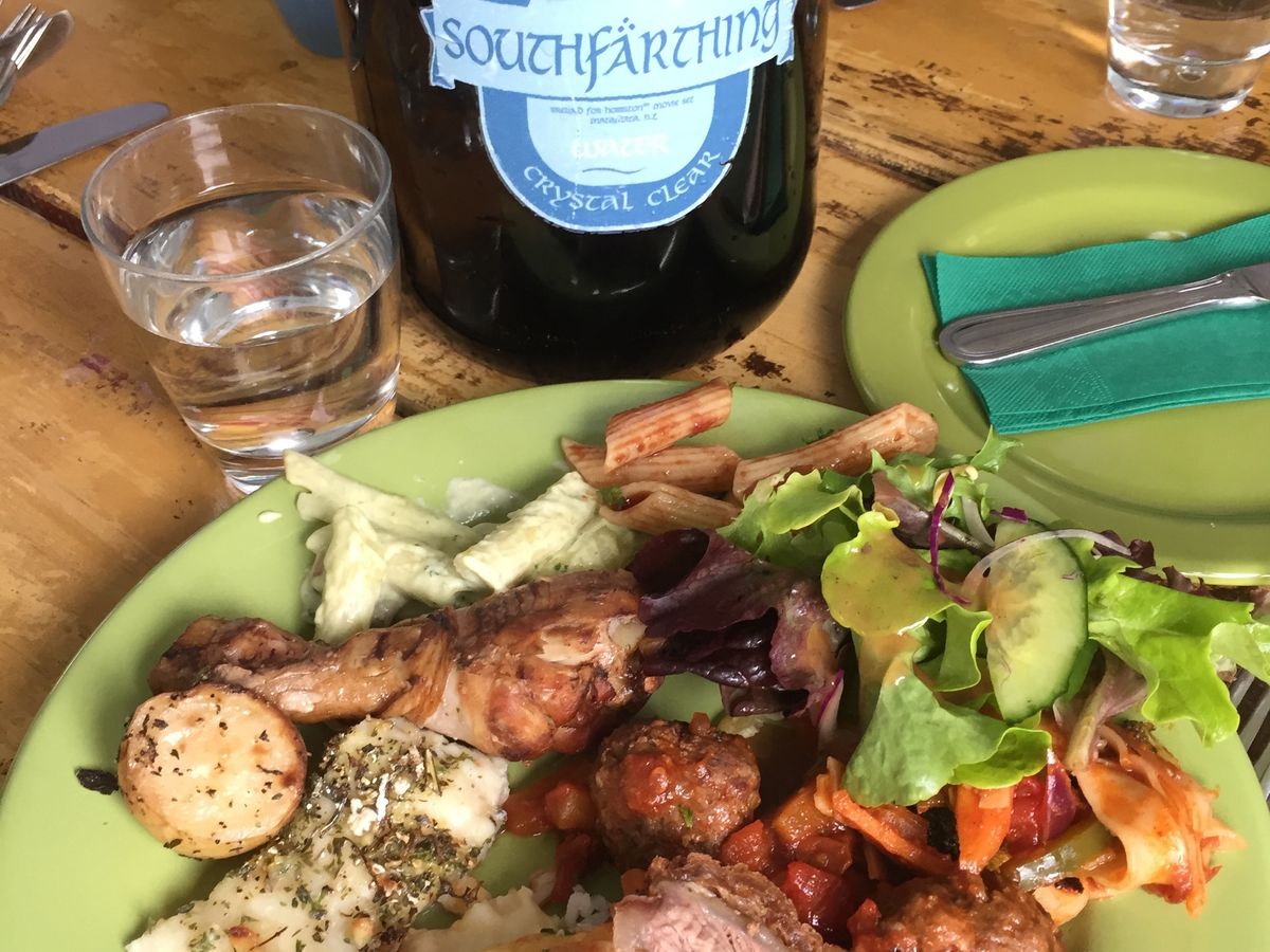 ホビット村の所有者のアレクサンドラさんの牧草地で草を食む羊を眺めながらのんびりランチできました。