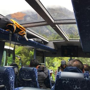 クイーンズタウンからの日帰りバス旅行。当初、片道の5時間はとても長くて嫌だなと思っていましたが、だいたい1時間半毎にトイレ休憩やカフェに寄ってくれるし、撮影ポイントも3カ所くらい止まってくれました。左右の窓は大きく、天井まで透明窓。朝が早くて眠かったのですが寝るのがもったいない片道5時間の旅です。バスの席は自由。私が参加したのは11月上旬で、半分くらい空きがありました。クイーンズタウンから乗る場合、右側の席の方が景観がいいかと思います。帰りは左がオススメ。でもなんとなくみんな同じ席に座って帰りました。