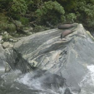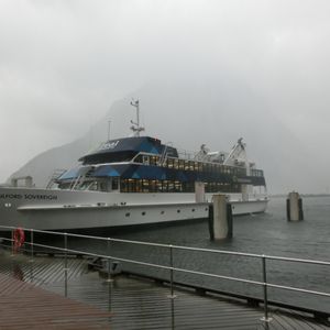 ミルフォードサウンドに近づくに連れ雲行きが怪しくなり、到着した時は霧のような雲と雨で何も見えない状況で乗船し見えたのは崖上からと思われる滝の飛沫と大きな岩で休憩するオットセイ親子だけでした。ガッカリ。