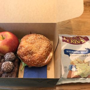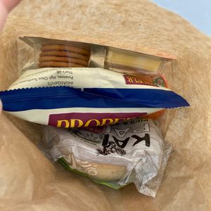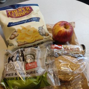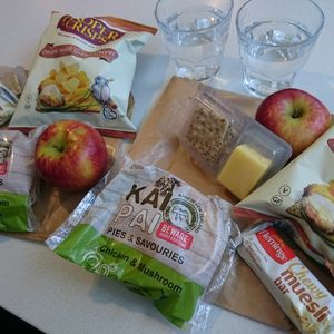 船上でランチチケットを引き換えます。中身は写真の通り。現地のスーパーで買えるもの詰め合わせですが、パイは温めてあり美味しかったです。