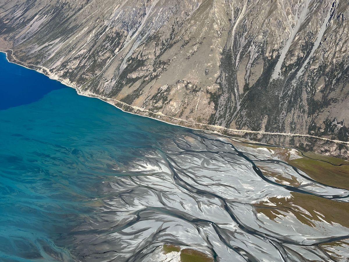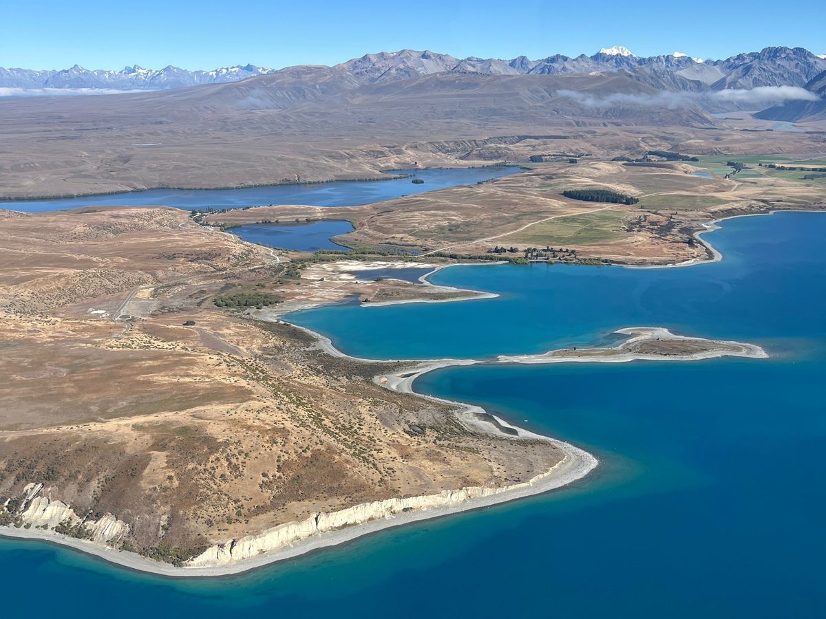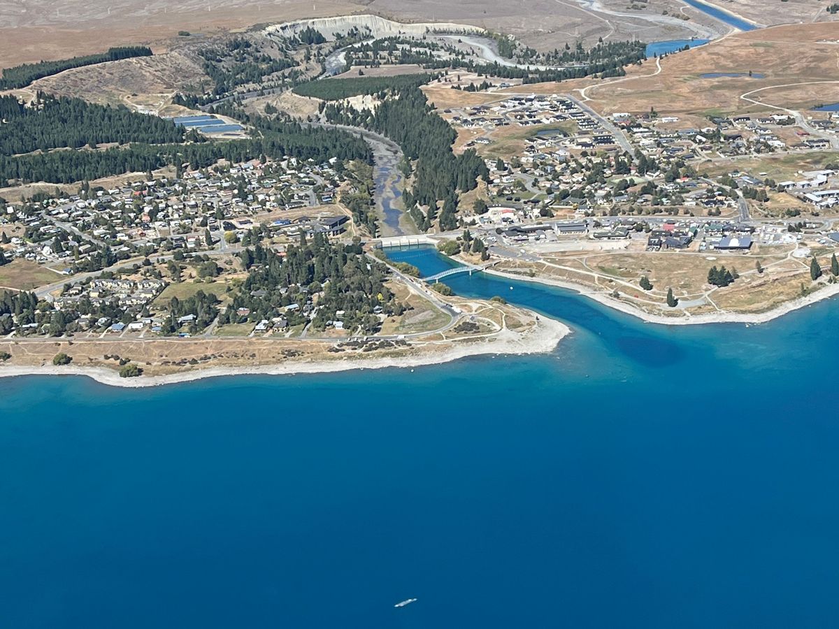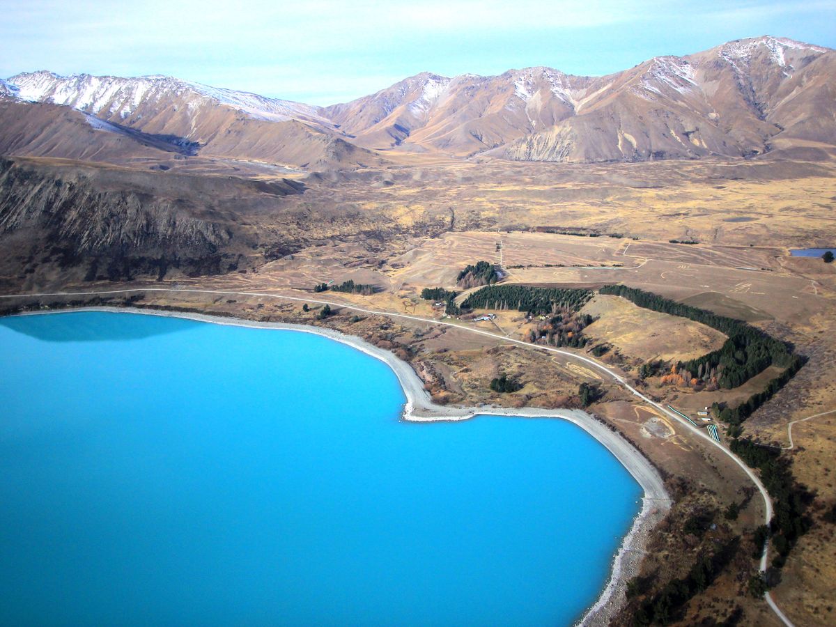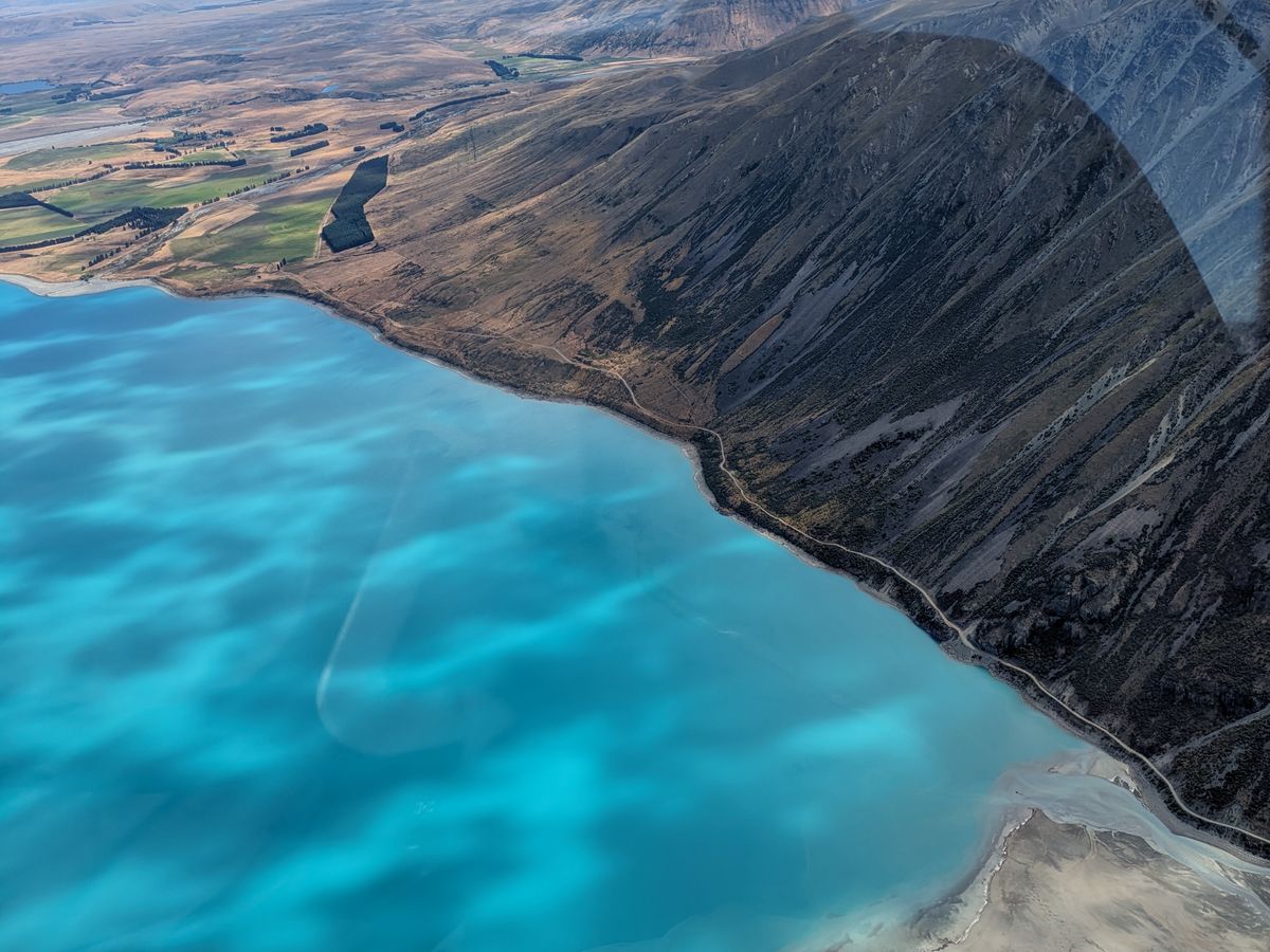 上空から眺めるテカポ湖のエメラルドグリーンの水が素敵でした。