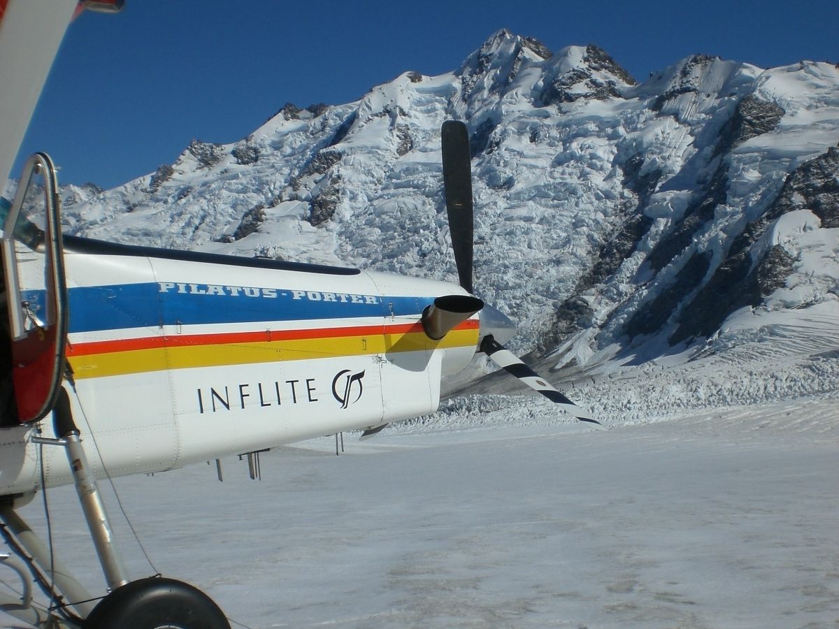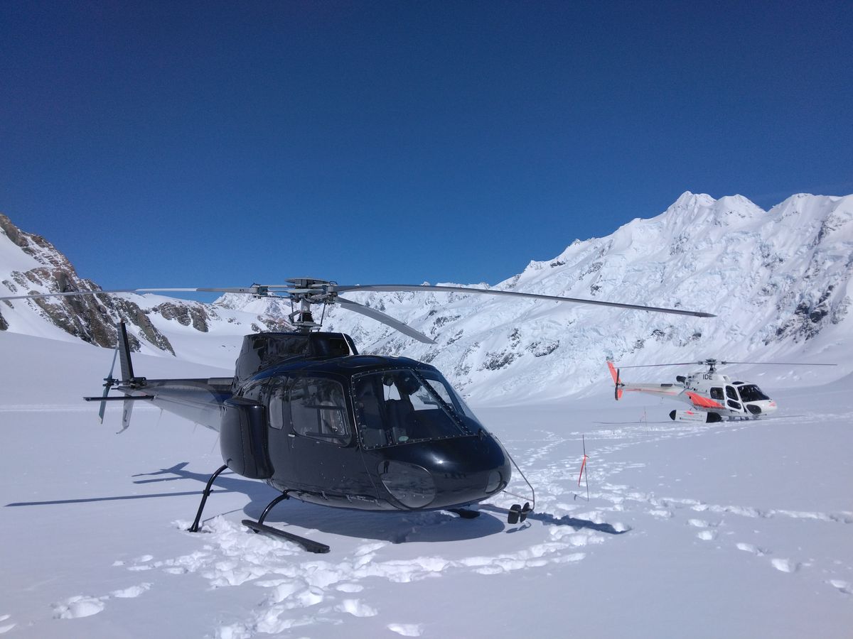 スキープレーンでは無く急遽ヘリコプターの遊覧飛行のグランドサークルに変更になりました。当日は快晴の天気に恵まれ我々は三組のカップルのフライトで、氷河に着陸するまでの行きはパイロットの横の席で正面からマウントクックのすぐ横を旋回し、サザンアルプスと氷河がよく見えました。自分のカメラやビデオで撮影出来て、ヘリコプターの長所は、山の頂きのすぐふもとの平な氷河上に約15分間着陸することが出来てパイロットからも写真を撮ってもらえますよ!又チップもいりませんでした。
