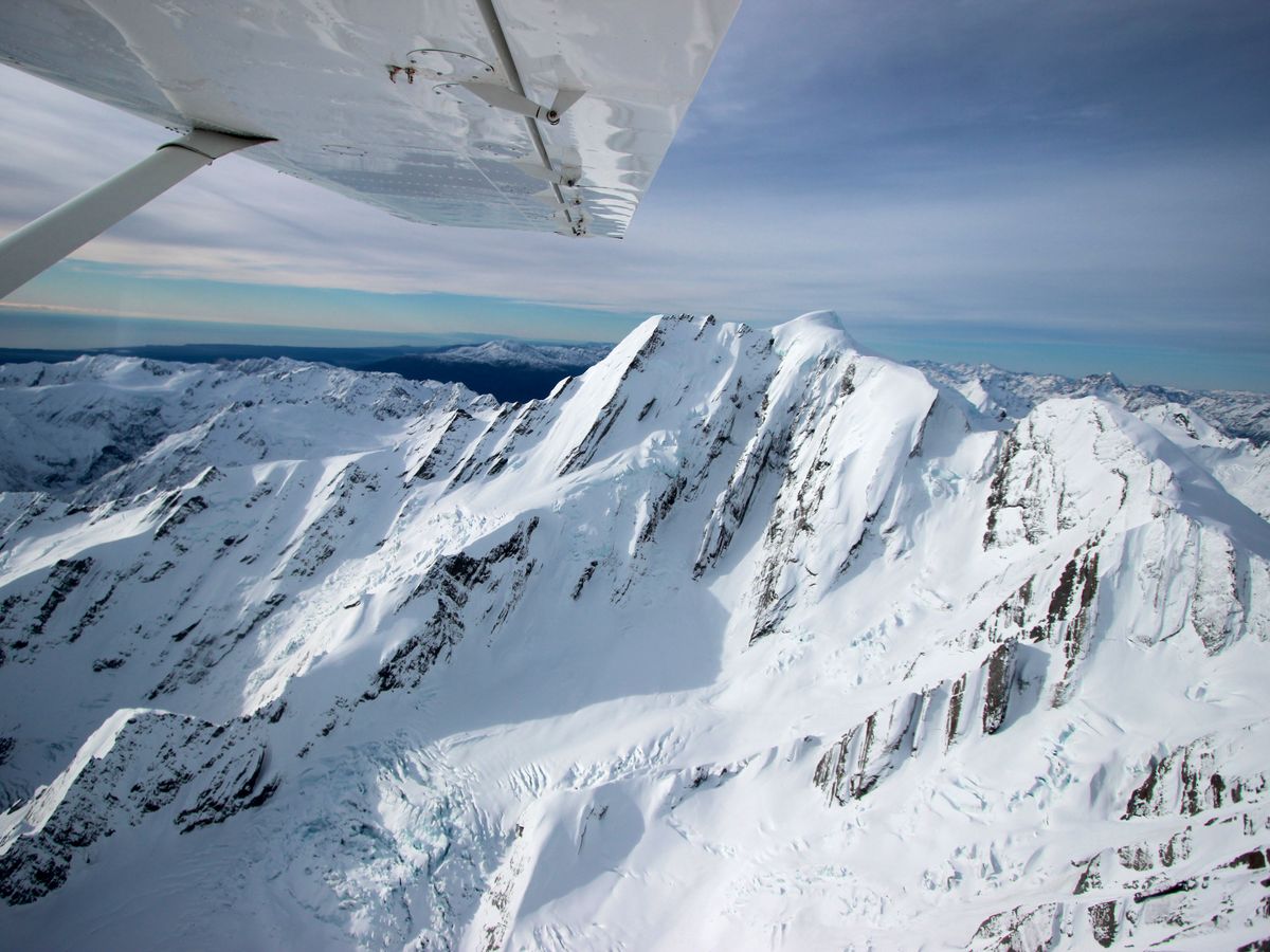 前日夜に吹いていた強風も収まり、朝9時からのフライトで、ほとんど雲の無い最高の景色を堪能しました。マウントクックでは、どちらの着座位置からでも見られるように旋回してくれます。