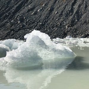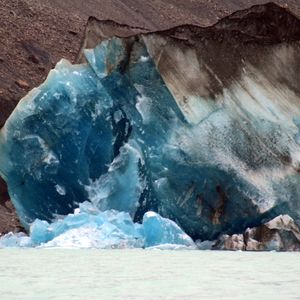 氷河は砂利で黒く薄汚れていて、ブルーに見えるところはごくごくわずかな