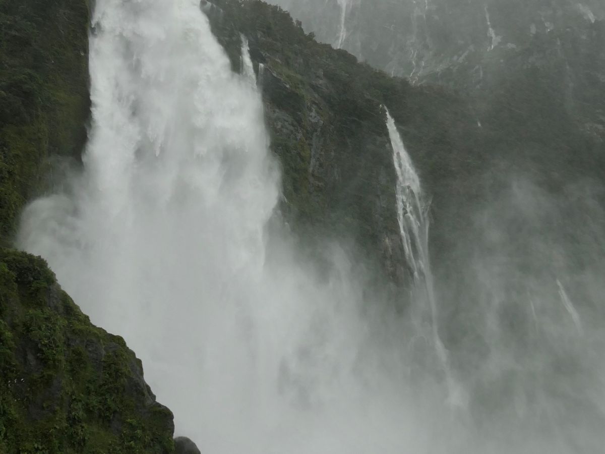 雨量が少なくても多くても 相変わらずダイナミックな光景でした。参加した日は雨で霧に包まれ最悪の天気だったが、天候の良い時とは違う幻想的なミルフォートサウンズが見えてみんな大感激でした。