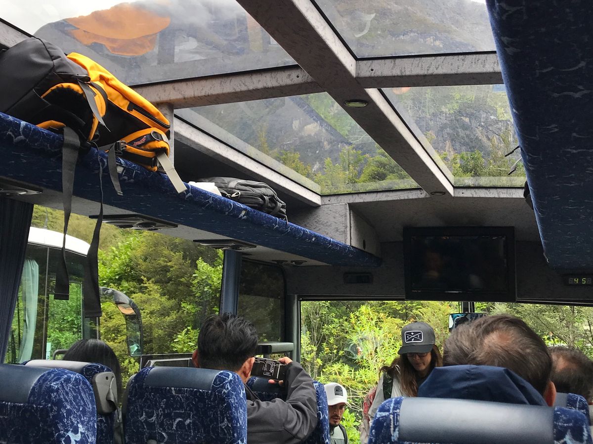 クイーンズタウンからの日帰りバス旅行。当初、片道の5時間はとても長くて嫌だなと思っていましたが、だいたい1時間半毎にトイレ休憩やカフェに寄ってくれるし、撮影ポイントも3カ所くらい止まってくれました。左右の窓は大きく、天井まで透明窓。朝が早くて眠かったのですが寝るのがもったいない片道5時間の旅です。バスの席は自由。私が参加したのは11月上旬で、半分くらい空きがありました。クイーンズタウンから乗る場合、右側の席の方が景観がいいかと思います。帰りは左がオススメ。でもなんとなくみんな同じ席に座って帰りました。