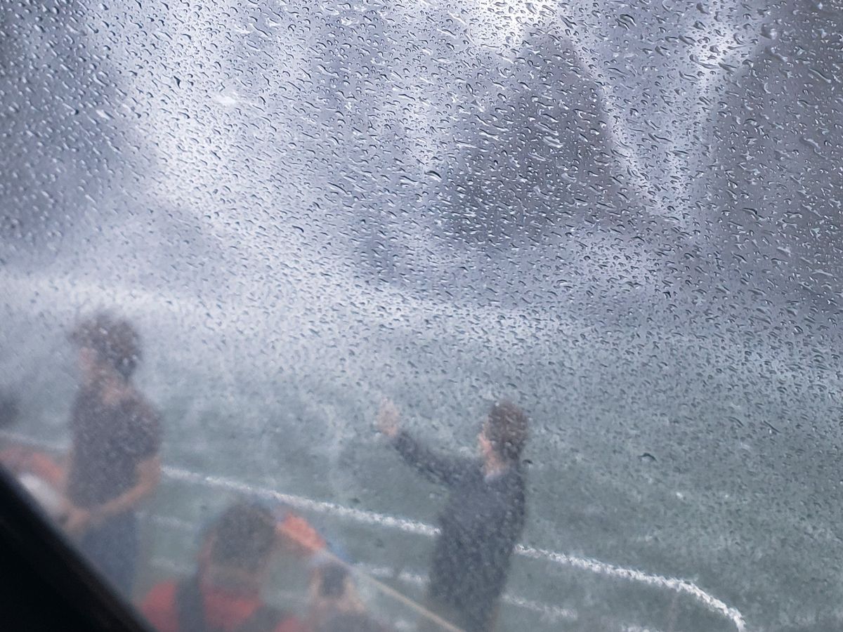 途中、滝に船先を突っ込むというイベントが発生します。前方の甲板に出ていると容赦なく濡れます。みんな楽しそうに水を浴びていました。レインコートは有料?分かりません、すみません。思いがけない水量に室内に逃げ込もうとしている人達もいましたが、出入り口のドア(この時は右側)は締め切りで行き来できません。無残にもびしょ濡れになっていました。逃げ口は確保しておきましょう。