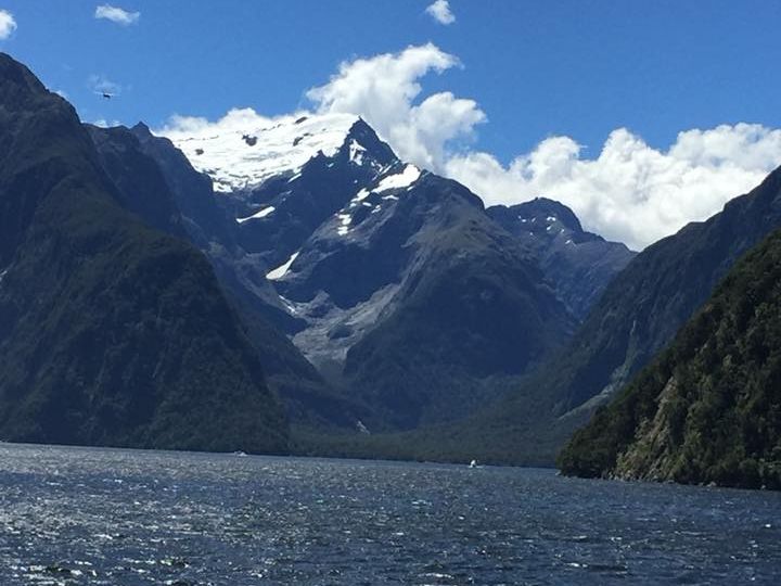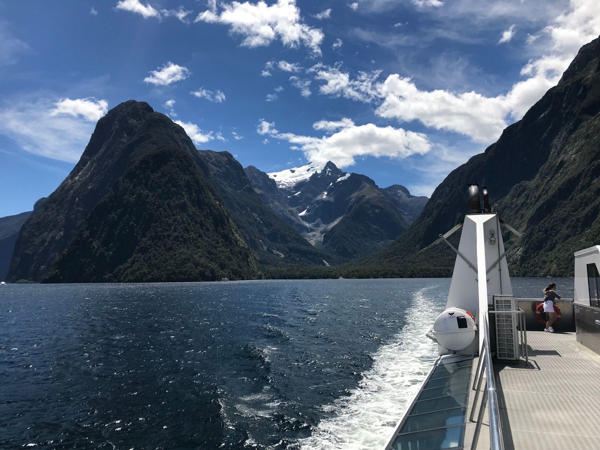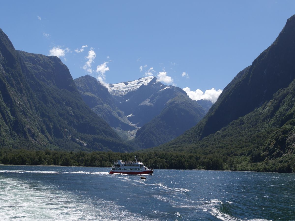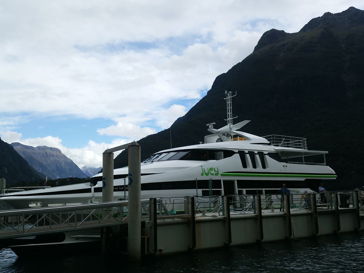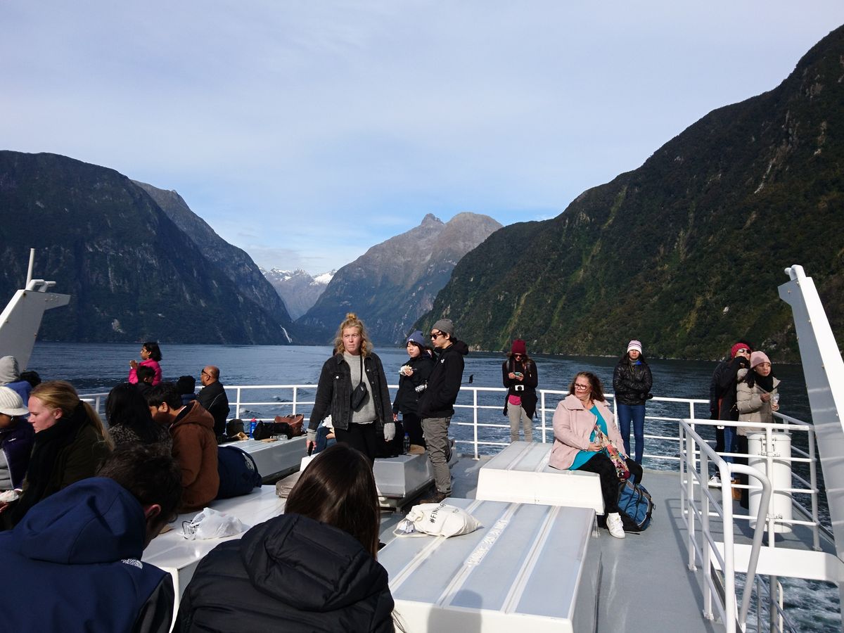 テアナウから参加しました。天気は快晴とは言えませんがマズマズでした。ミルフォードサウンドの午前便10時50分に乗船したのでガラガラ広い船内を上に、先端、後方と自由に動け快適でした。当然今回の運転手さんも目的地までずーっと解説していました。1時間40分で着くので、途中3,4回 look out 地点でバスを停車させ写真をバシバシ。解説バンバン。帰りも解説付き。