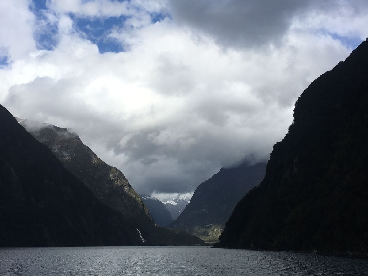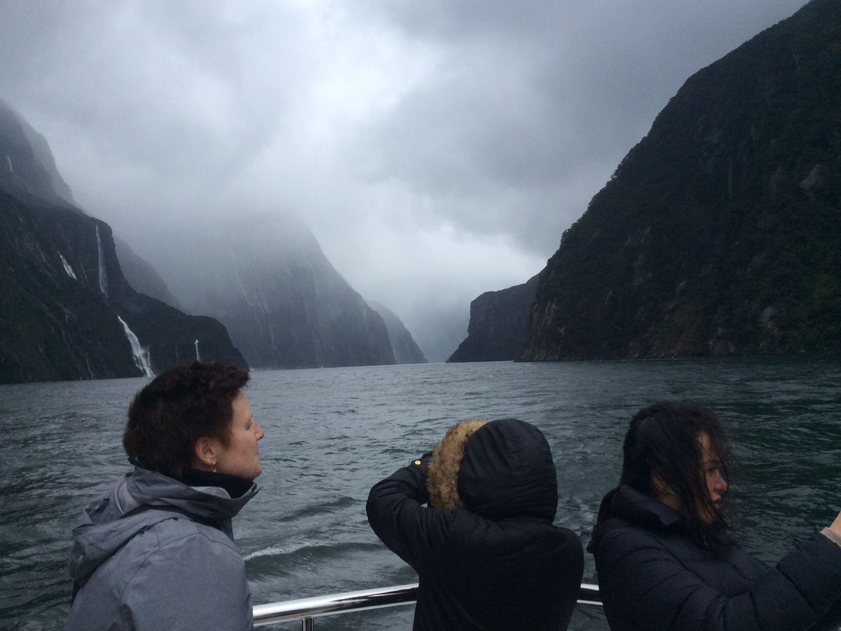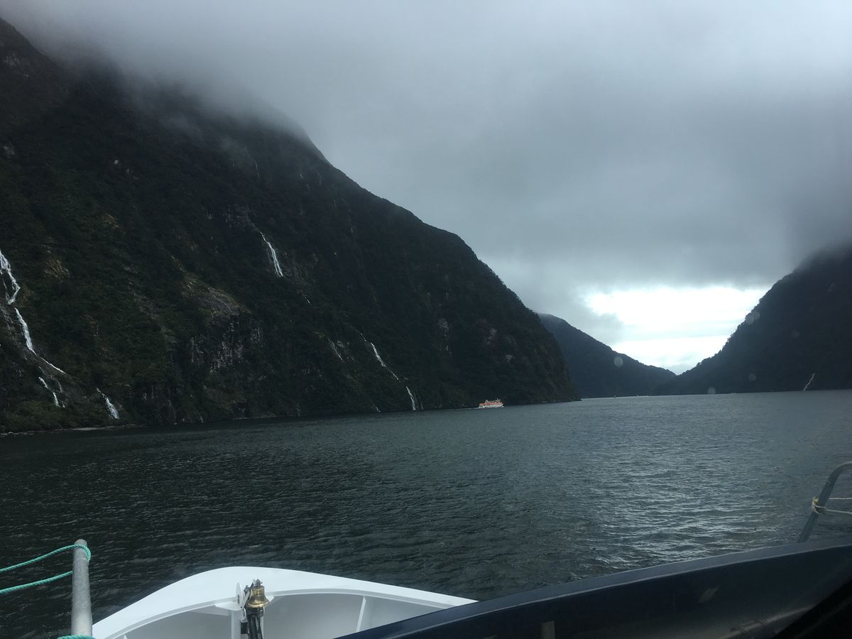 クイーンズタウンからの道中はほとんど快晴でしたが、さすがフィヨルド地帯、近づくにつれて雲が多くなってしまいましには雨には合わず、デッキの上に出て雄大な景色を十分に堪能できました。ただ、青空ではなかったので、写真のような海の青さはありませんでしたが。ただ、幸いにも野生のアザラシやペンギンもみることができたし、滝のしぶきをたっぷり浴びたので数歳若返ることができたし、良かったです。寒さ対策を十分にしてして参加され、クルーズの間ずっとデッキに陣取ってみるとよいかと思います。実は、ノルウェーのフィヨルドを数回経験をしており、それと比較すると規模ではやや小さく感じましたが、その代わり延々と続く羊、乳牛アルパカ等々の家畜農場を見ながらの旅もこれまた素晴らしいと思いました。