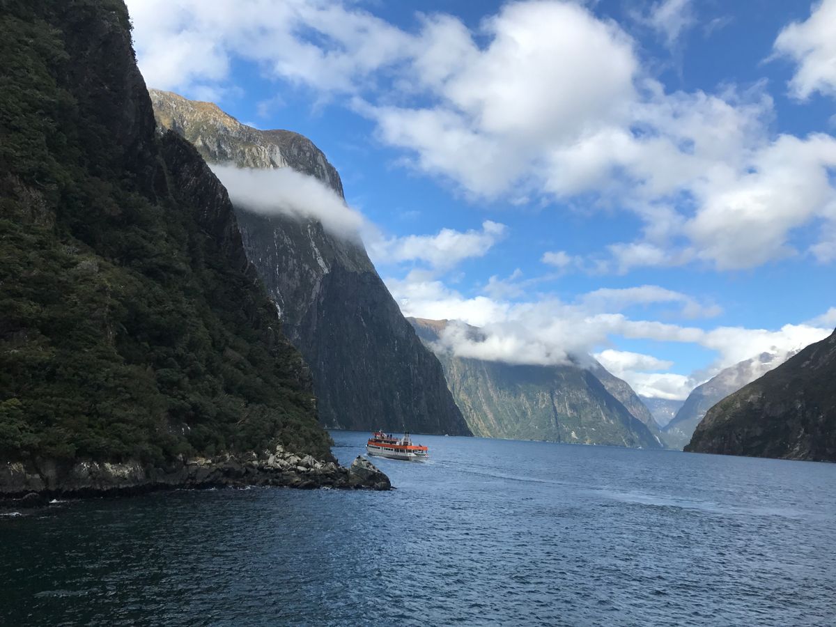 道中晴天でしがミルフォードサウンドに着いた頃には少々重い雲となりましたが雨は大丈夫でした。船に乗ってからは感動に尽きます!フィヨルド地形の滝の絶景、途中イルカが寄ってきてテンション上がりました!アザラシなども見れましたがペンギンは遭遇できず。。。船内ではランチ付きで予約していてカレーをチョイスしておきましたが美味しかったです。