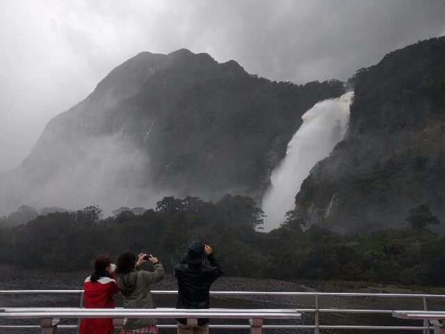 現地までの長い道中も日本人ガイドさんが、車窓風景や通過する土地の詳しい説明をしてくださり、飽きることはありません。途中までは日がさすこともあり、バスの前方には次々と大きな虹が現れ、気分を高揚させてくれました。ドライバーおすすめの写真撮影スポットでは、バスからおりて、川から美味しい水をペットボトルに補充したり、散策できたりと楽しめます。ミルフォードは暴風と雨でしたが、お天気の日には見られない無数の滝とそれが下まで落ちるまえに風で吹き上げられる様は圧巻でした。暴風雨の中のクルーズもイルカの群れがみれたり、それなりに楽しいものでした。帰路、途中休憩をするテアナウ湖畔の日本人の方が経営するカフェで、おうどんをたべましたが、とてもおいしかった。クイーンズタウン帰着は遅くなるので、お腹やすめにおすすめです。