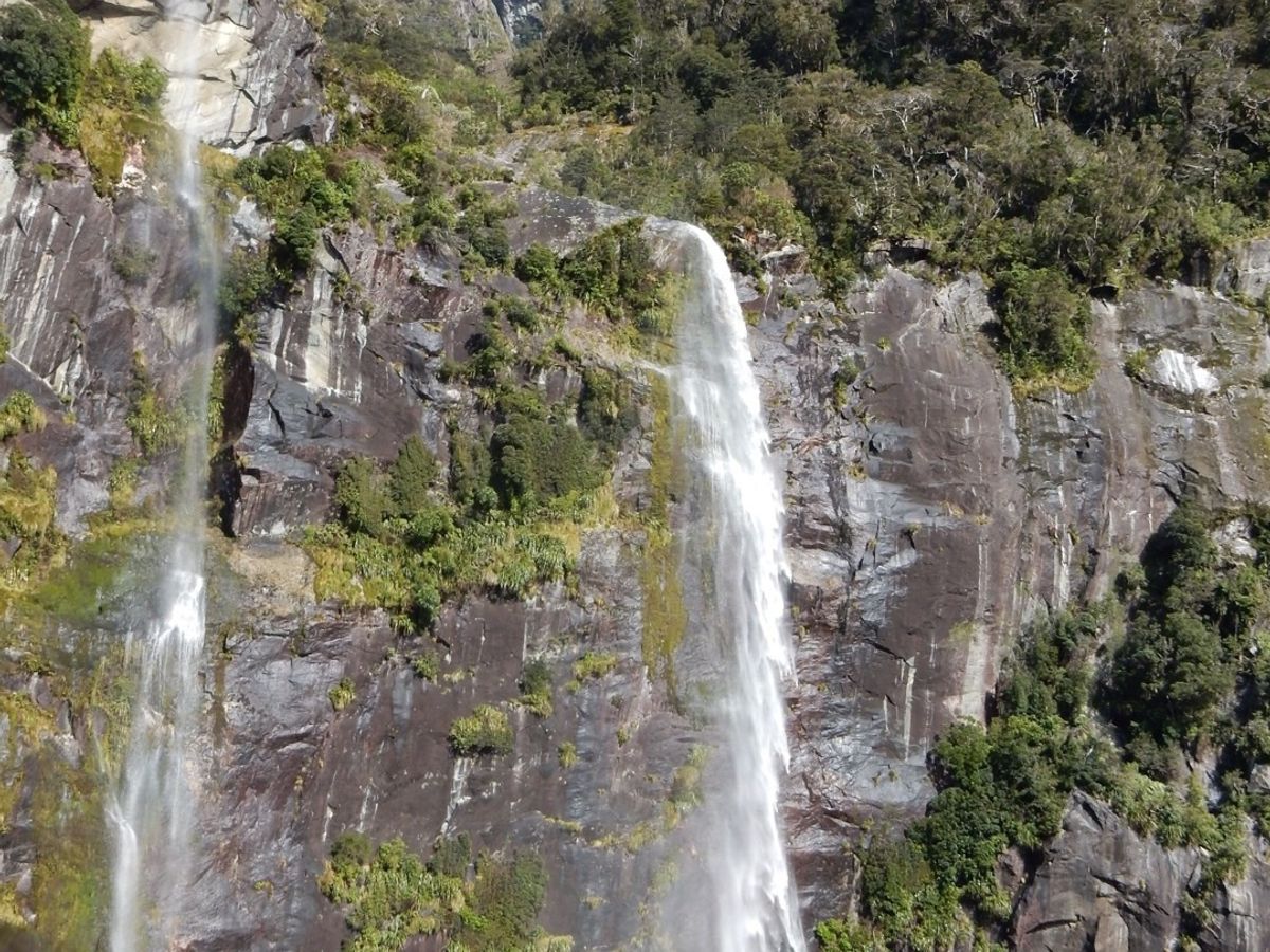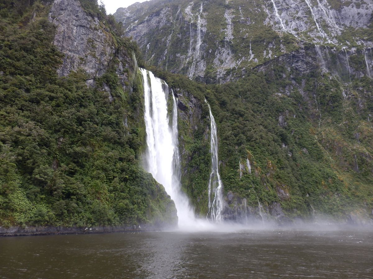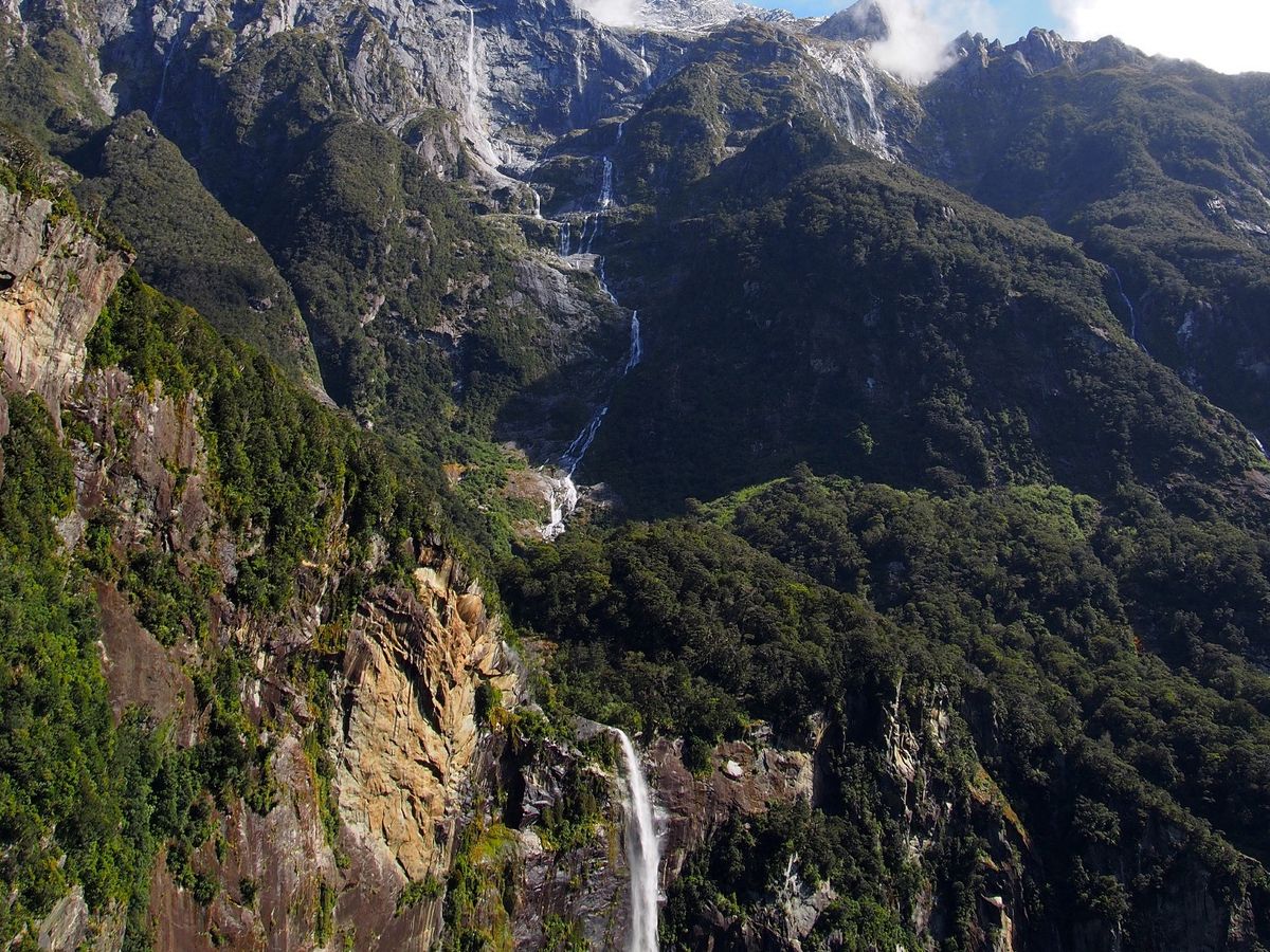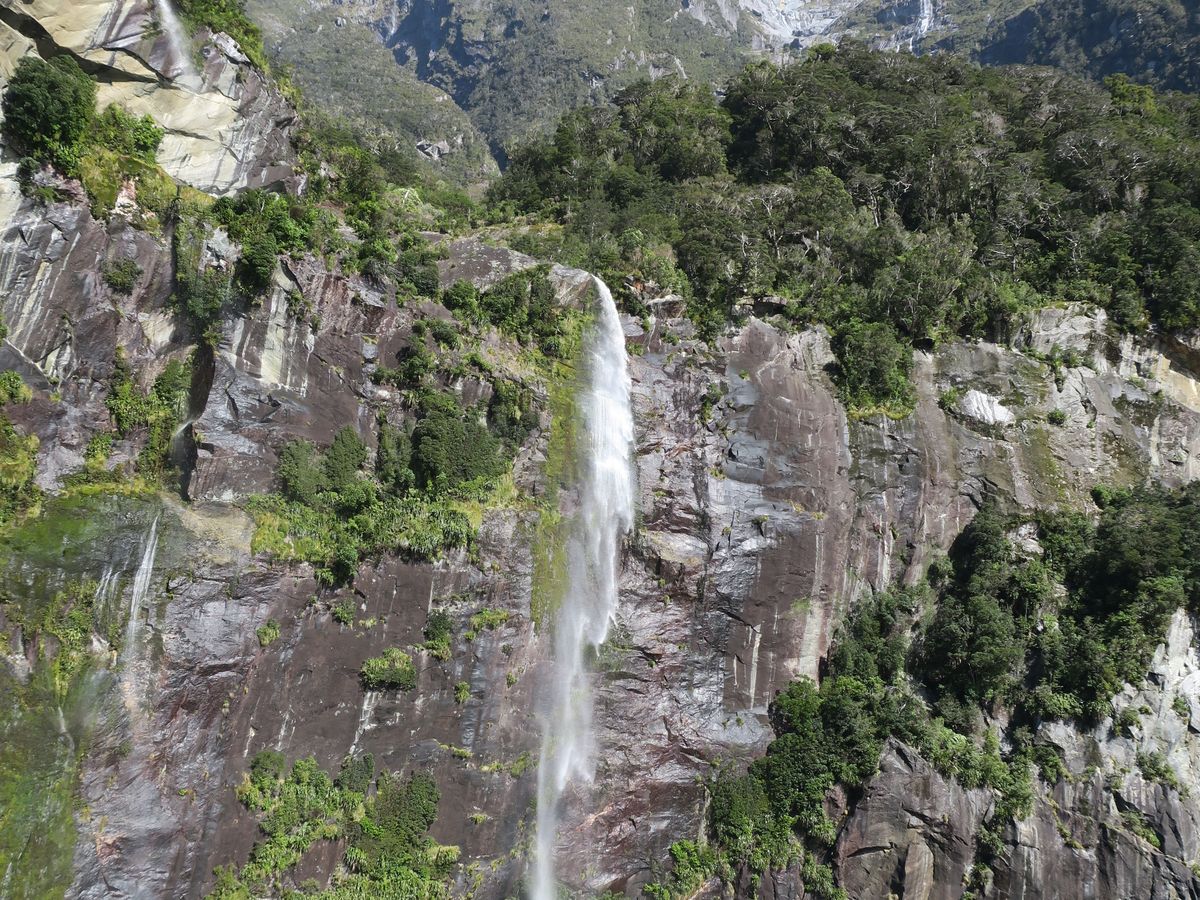 テ・アナウを出発すると、3回ドライバーさんお気に入りの写真スポットで5〜10分程度の休憩(内1回はトイレもありました)があります。山々が小さい湖?に写るミラーレイクや氷河によるU字谷など、それは美しく、フィヨルドに着く前から大感激です。また、前日に雨が降ったのおかげで、普段は見られない滝が多数みられました。(前日は雪崩もあって、ミルフォードサウンドへの道は封鎖されていて、このツアーは代替として、ダウトフル・サウンドへ向かったとのことでした)