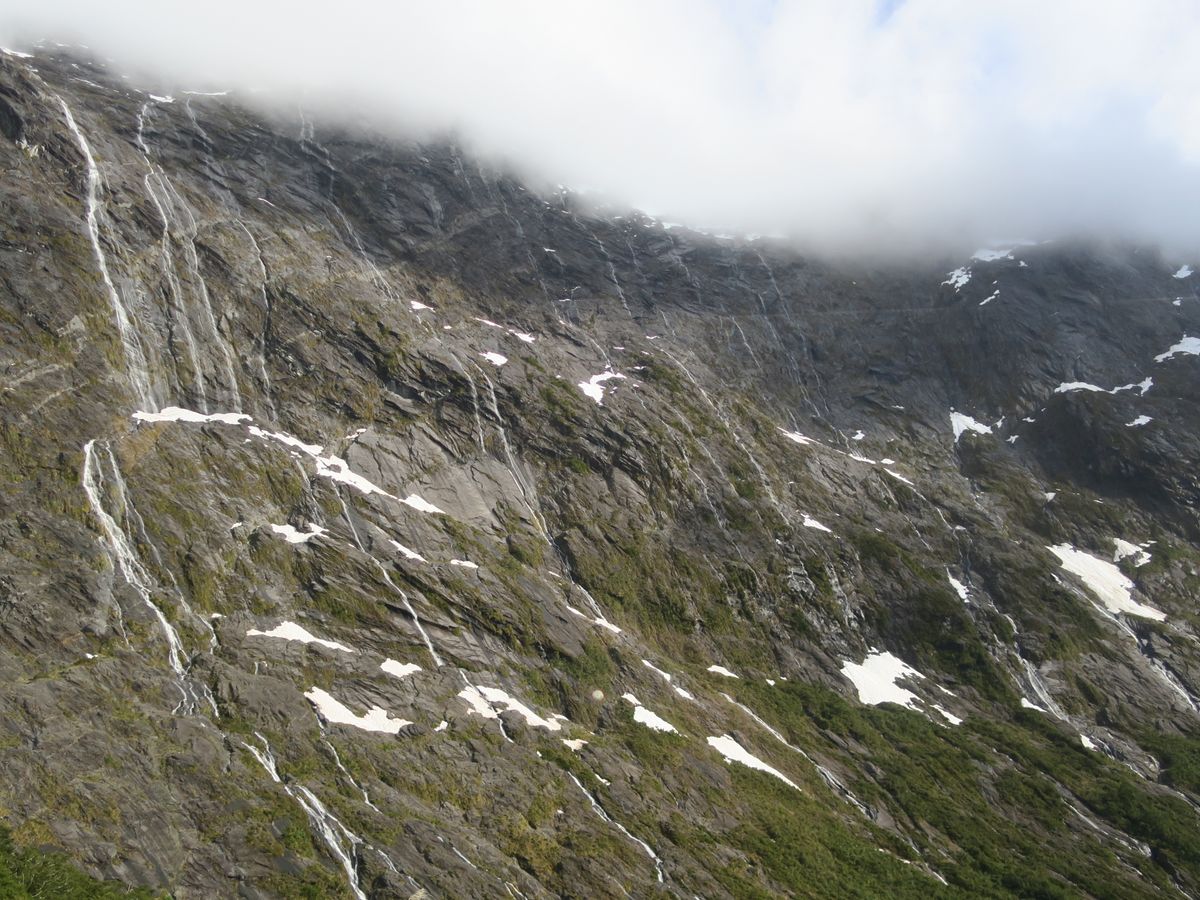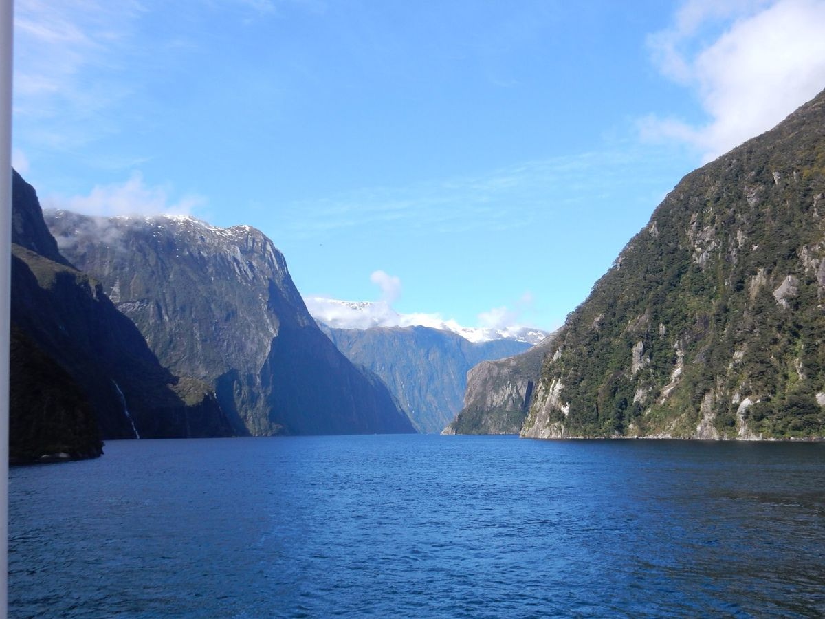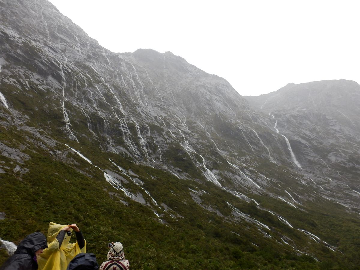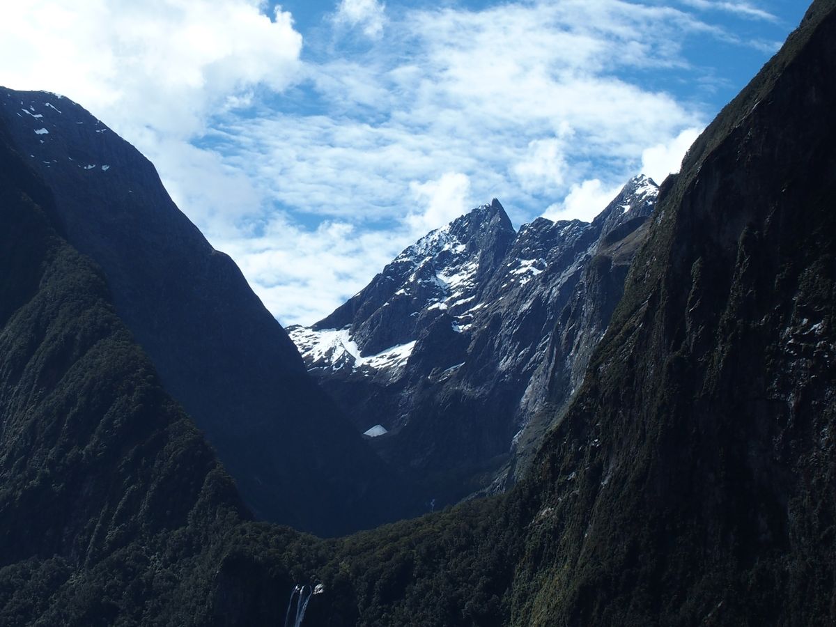 テ・アナウを出発すると、3回ドライバーさんお気に入りの写真スポットで5〜10分程度の休憩(内1回はトイレもありました)があります。山々が小さい湖?に写るミラーレイクや氷河によるU字谷など、それは美しく、フィヨルドに着く前から大感激です。また、前日に雨が降ったのおかげで、普段は見られない滝が多数みられました。(前日は雪崩もあって、ミルフォードサウンドへの道は封鎖されていて、このツアーは代替として、ダウトフル・サウンドへ向かったとのことでした)