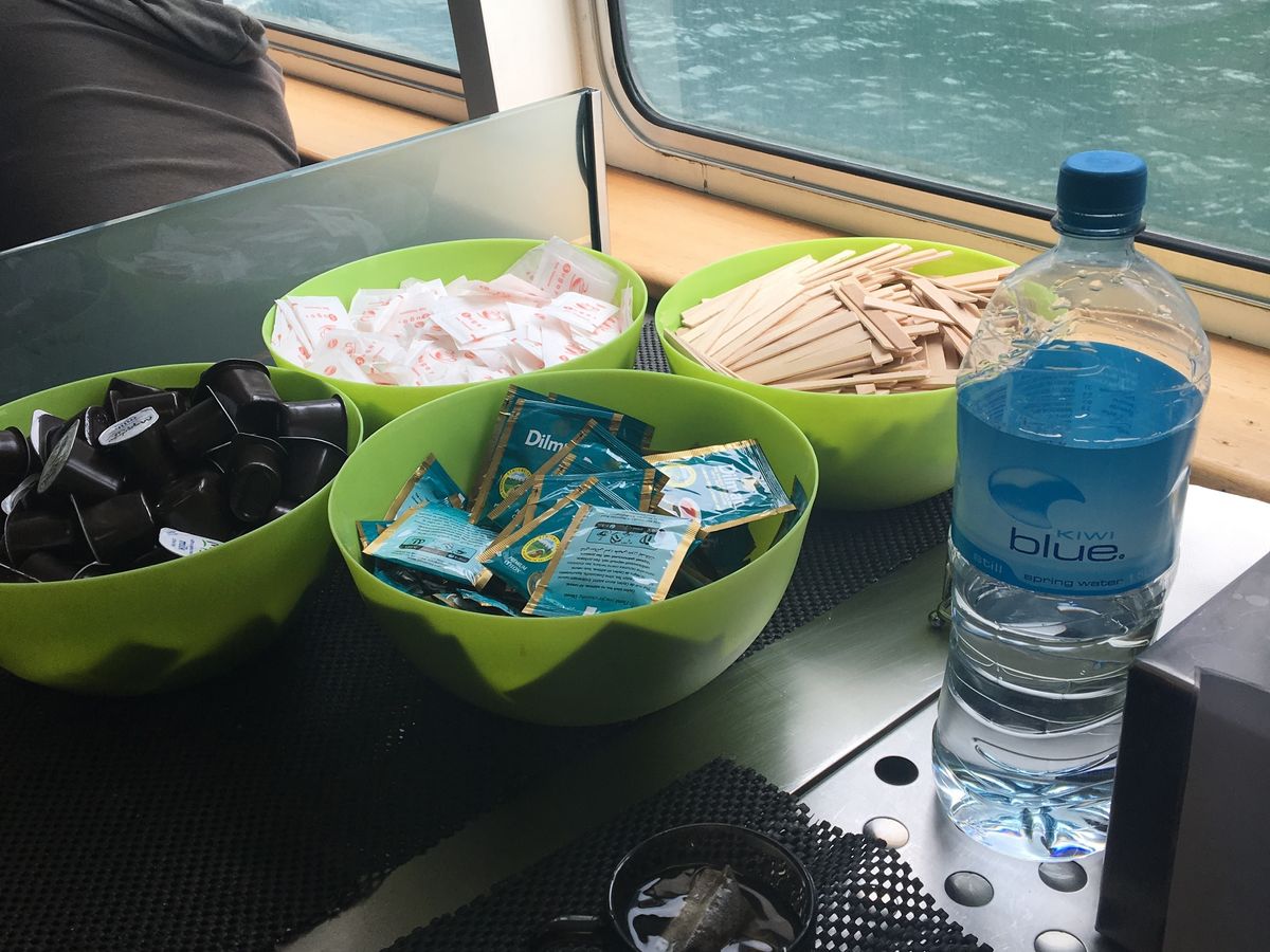 船内ではコーヒー、紅茶、水が無料で提供され、持ち込んだ鹿肉パイをテーブル席で食べることができました。