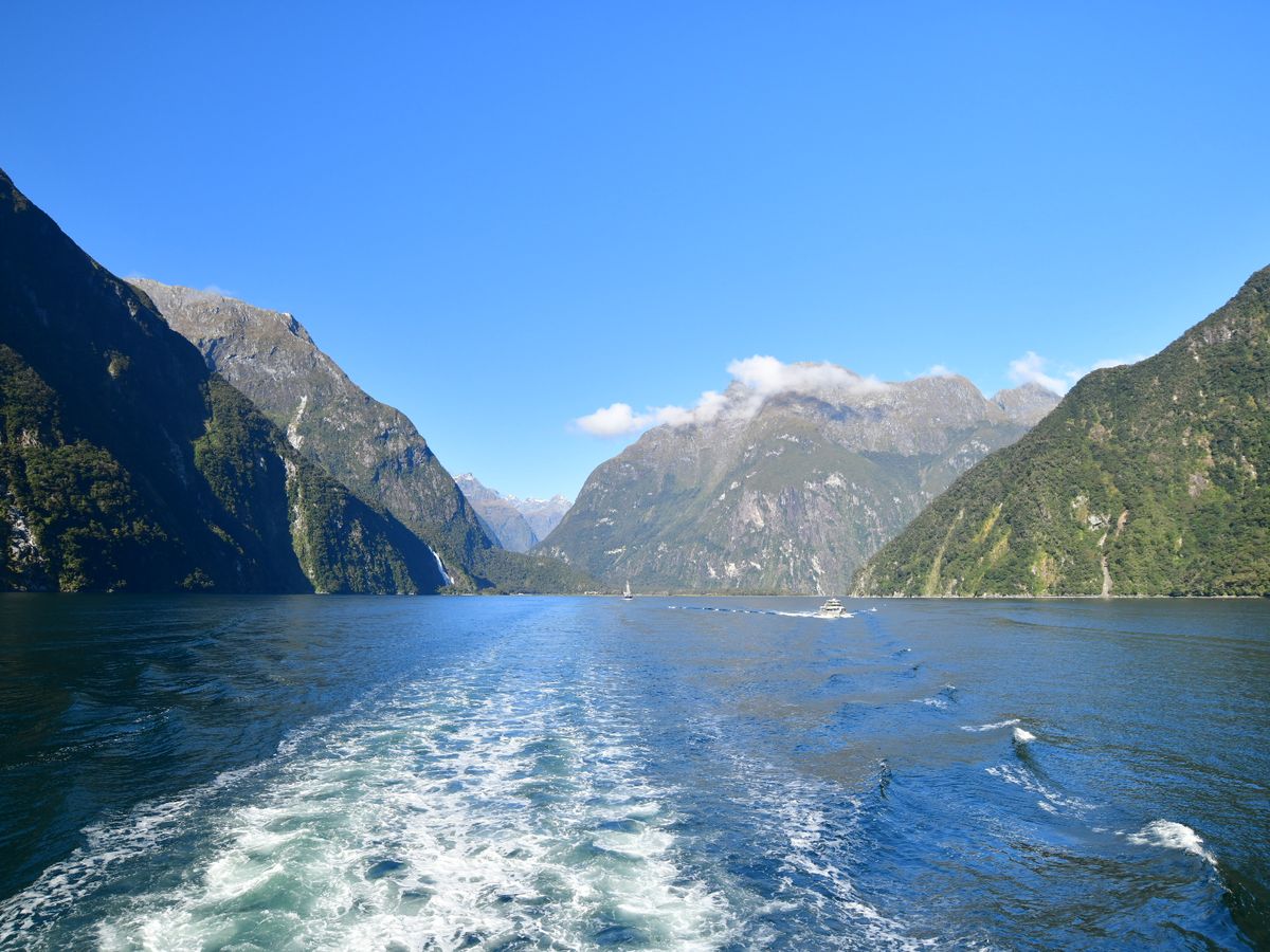 クイーンズタウンからは片道4時間強.途中,テナウからたくさん参加者が追加される形.フィヨルドの船からの景観はそれだけの時間をかけても行く価値がある.Mirror lakeなど,途中の絶景で写真撮影のための時間が配分されている.天気に恵まれて快晴だったので景色がよく映えた.