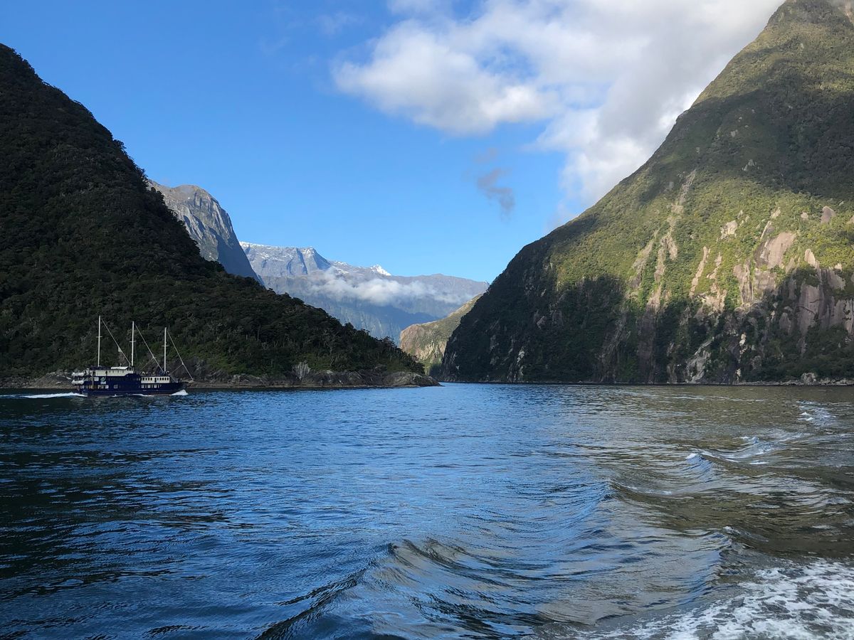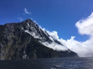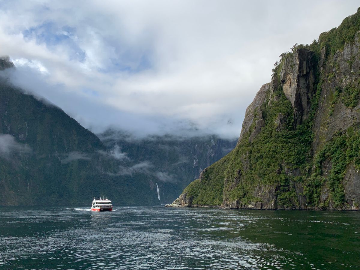 ミルフォードサウンドに着いてからはあいにくの雨で霧が濃かったですが、雨だからこその水量の滝が見れるという船のアナウンスを信じ、迫力のある風景が見れました。船が思ったより滝に近づいたのでびしょ濡れになっていた人もいましたが、楽しめました。