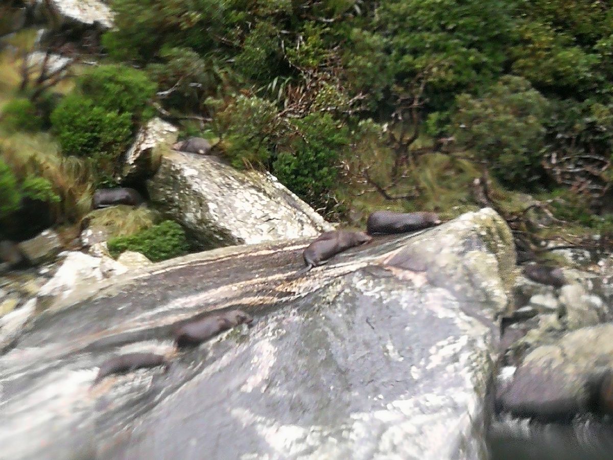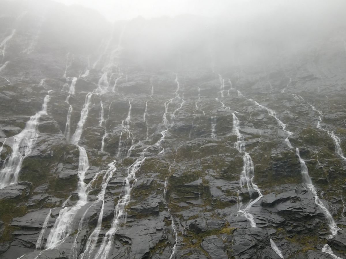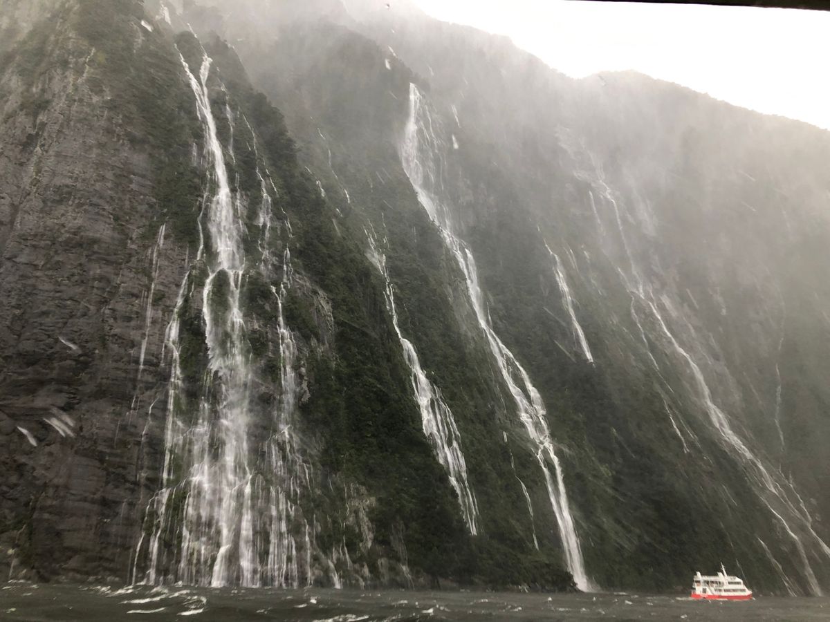 ミルフォードサウンドに近づくに連れ雲行きが怪しくなり、到着した時は霧のような雲と雨で何も見えない状況で乗船し見えたのは崖上からと思われる滝の飛沫と大きな岩で休憩するオットセイ親子だけでした。ガッカリ。