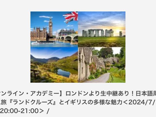 満席御礼【オンライン・アカデミー】ロンドンより生中継あり!日本語周遊バス旅『ランドクルーズ』とイギリスの多様な魅力<7/19 (金)20:00-21:00>