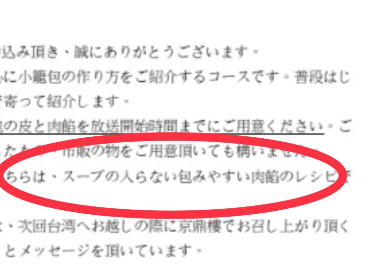 ・レシピを頂くのは、「スープ無しの小籠包」です。材料も豚肉や醤油や塩という大変シンプルなもの。(お店で通常販売されている小籠包は特別なスパイスを使用し、日本では入手できないし、初心者が作りやすいようにとの配慮から。)なお、スープ有りの小籠包はお店で食べてね、とレシピに記載されています。