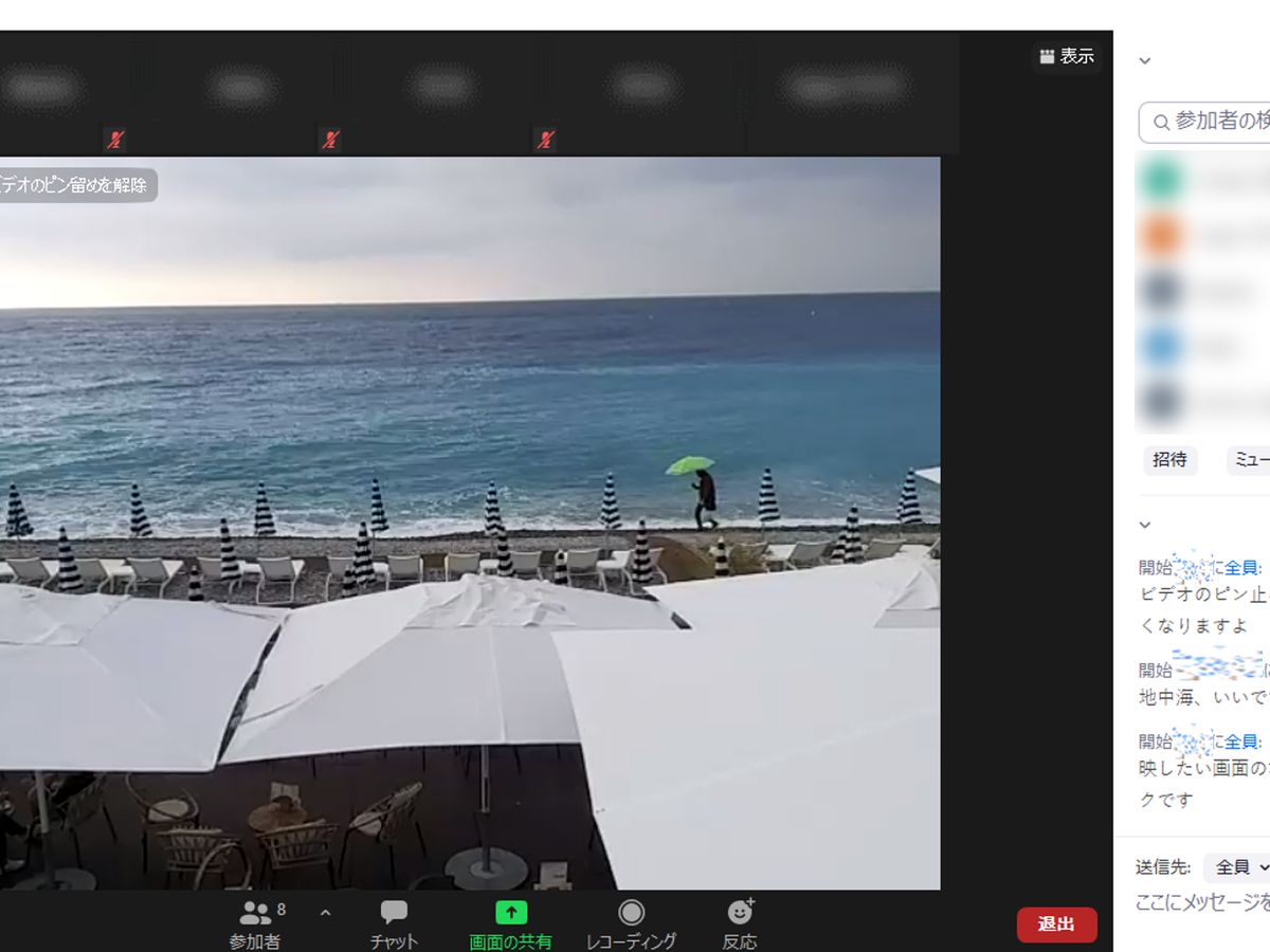ZOOMのオンラインツアーは3回目だったのですがこのツアーではホストと別にビデオ撮影するカメラマンがいるために何も撮影していないホスト画面が大サイズ、カメラマンの画面が参加者一覧と同じサイズのままツアーが始まり、ビーチでのスクリーンショットタイムとなって焦りました。他のゲストがチャットでカメラマンのビデオをピン留めする方法を教えてくれたので何とか一枚スクショできました。