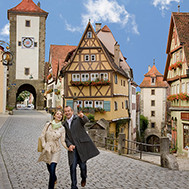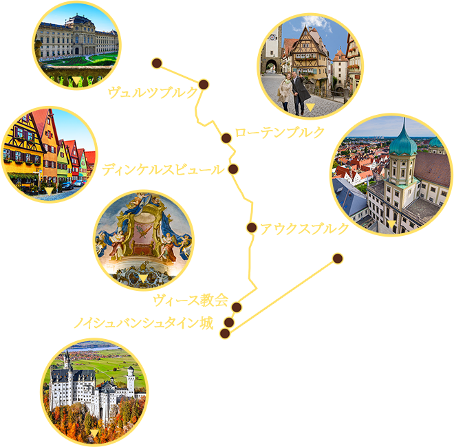 ローテンブルクは、ロマンチック街道の中でも人気が高いスポットのひとつです。中世から変わらない風景を保つこの街は街道のハイライト。カラフルな木組みの家や城壁が残る街中を歩くだけで、まるでおとぎの世界に迷い込んだかのよう!特産の揚げ菓子「シュネーバル」もご賞味あれ。 年中クリスマスの ケーテ・ウォルファルト・クリスマスヴィレッジ も必見です。