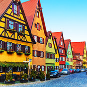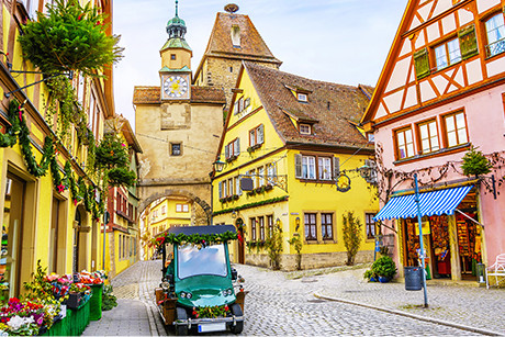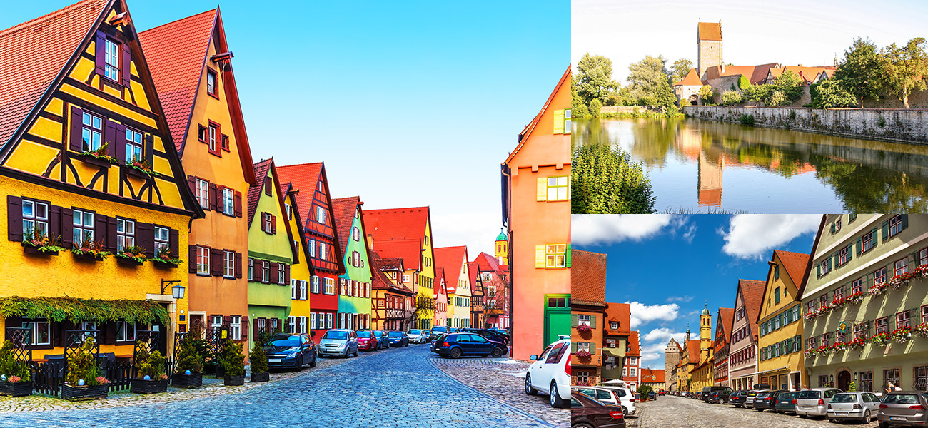 第二次世界大戦の被害をほとんど受けず、中世の姿がそのまま残る、円形の城壁と門塔に囲まれた街ディンケルスビュール。街の中心地マルクト広場には、木組みの家を始めとしたカラフルな建物が並びます。中でもドイツ·ルネサンス建築の代表作である、ホテル兼レストラン「ドイチェス·ハウス」は必見です。