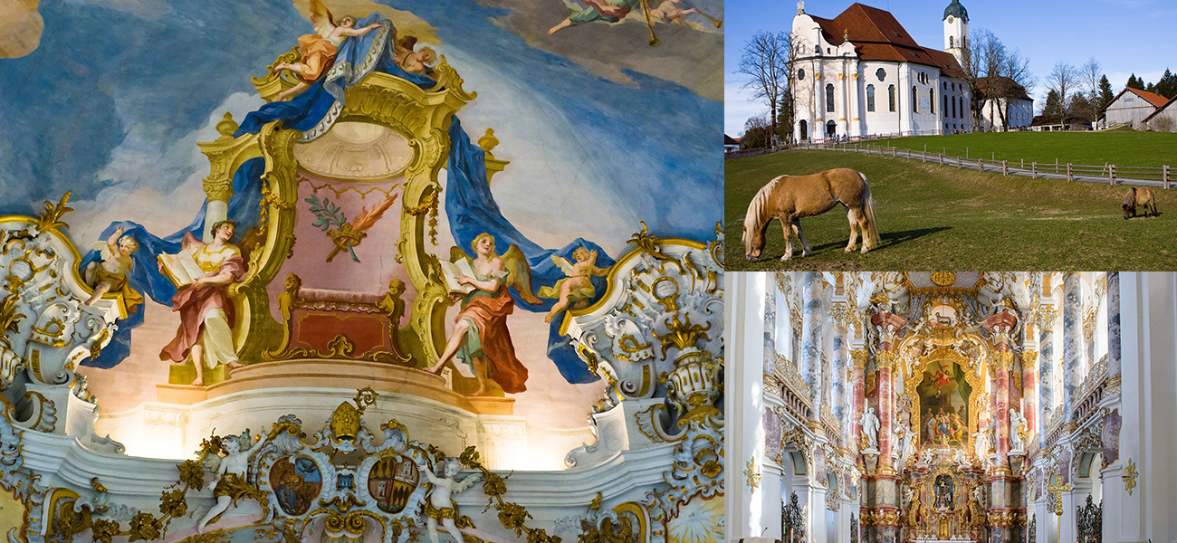 フュッセン郊外の村に静かにたたずむ小さな教会。ロココ様式の華やかで壮麗な内装やフレスコ画は、訪れる人々を圧倒するほどの美しさ。主祭壇には、涙を流したという伝説を持つキリスト像が祀られています。