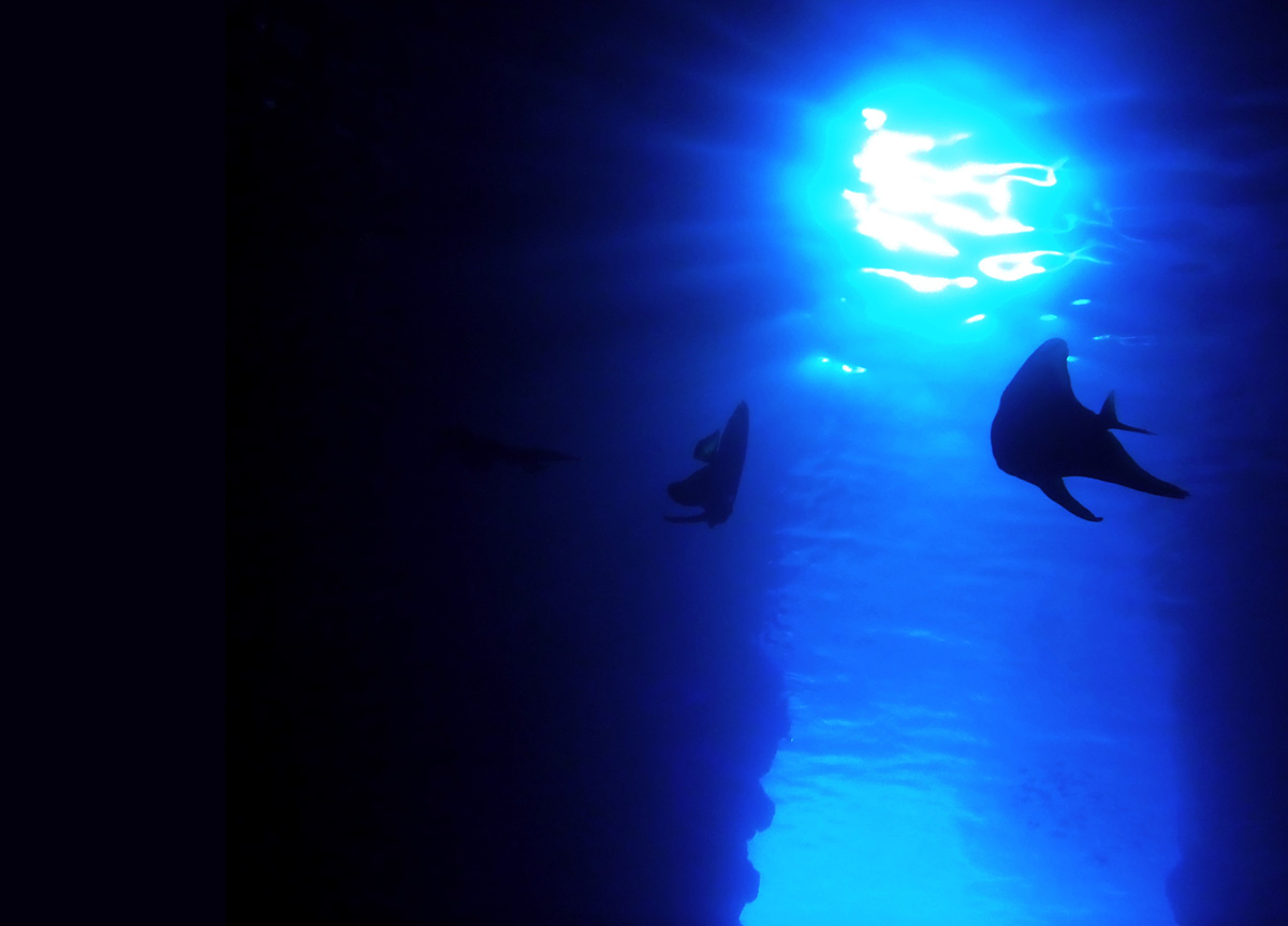 入口から差し込む太陽の光は海底の石灰岩に反射し、青い光となって海面に降りそそぐ―。