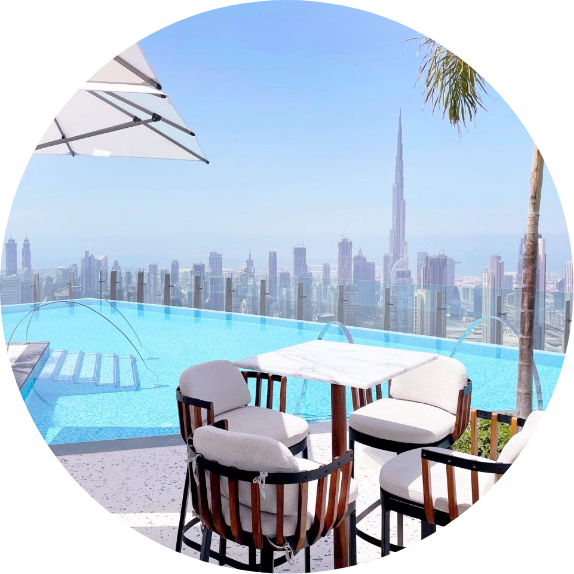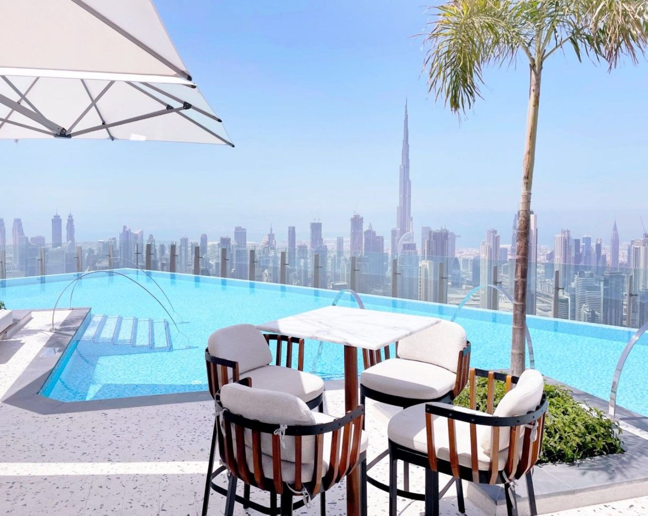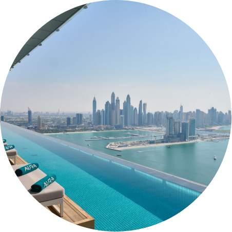 2021年4月にオープンした5つ星ホテルの75階にある絶景インフィニティプール。ダウンタウンの高層ビル群の頂上や摩天楼ブルジュ・ハリファが同じ目線に広がります。