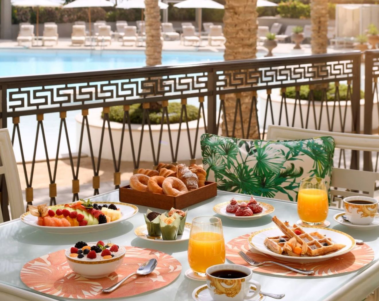 ドバイNo.1の朝食にも選ばれた5つ星レストランで優雅なドバイの朝の時間を。インテリアや食器は全てヴェルサーチ製で朝から気分が上がること間違いなし!