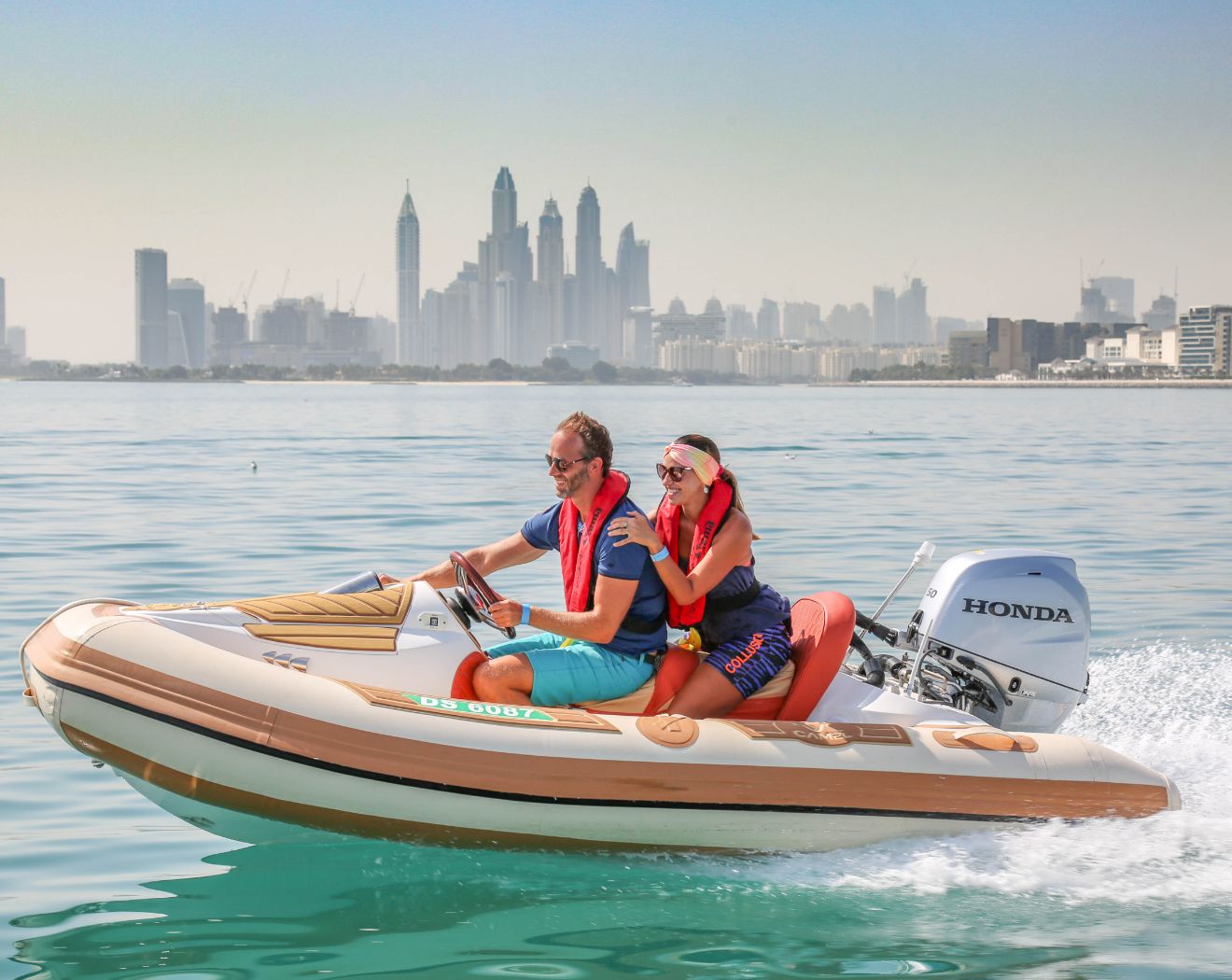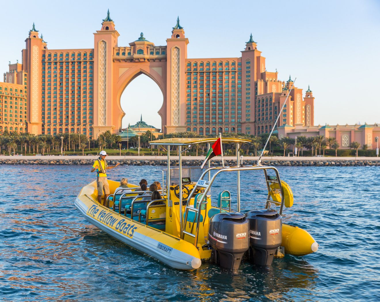 海上からドバイの目玉スポットを巡る観光ツアー「イエローボート」。海のアトラクションのような感覚ですが、水には入らないので私服のままで体験できるのも嬉しいポイント。