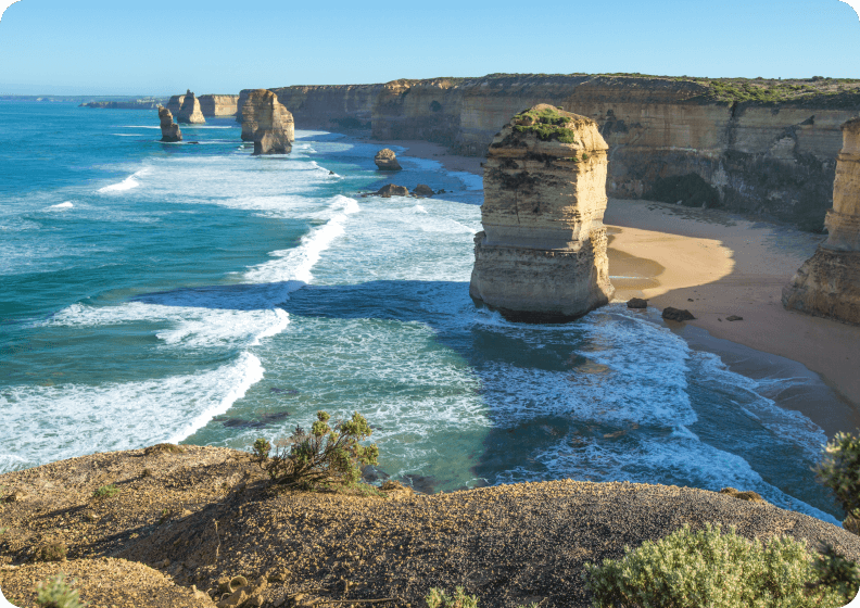 メルボルンから南西へ約100km、グレート・オーシャン・ロードはその名のとおり約280kmにわたる絶景の沿岸ロードです。見どころはアートのような奇岩群。中でも有名な「12使途」は、もともとは12の岩が一定間隔で点在していたものが長い年月で風化、崩壊して現在は8つの岩柱となっています。テディーズ展望台からの光景は息をのむような美しさ。