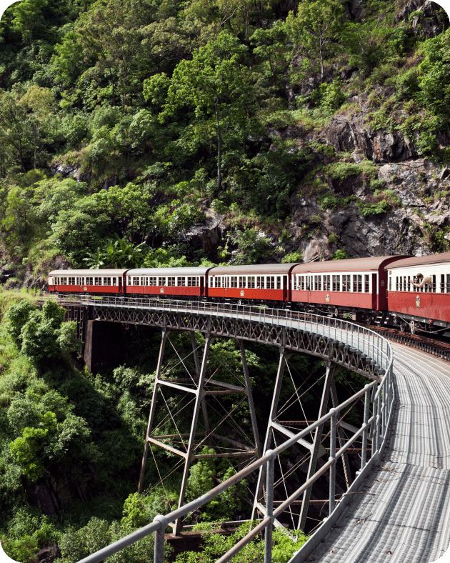 ケアンズから日帰りでダイナミックな大自然を体感できるスポットとして人気のキュランダは、世界最古の熱帯雨林と、その大自然の中を駆け抜ける高原列車が魅力です。熱帯雨林は1988年に世界遺産にも登録されていて、最大の見どころとなる豪快なバロン滝は、展望台から眺めることもできます。雄大な熱帯雨林を上空から眺めるスカイレールも見逃せないアクティビティです。