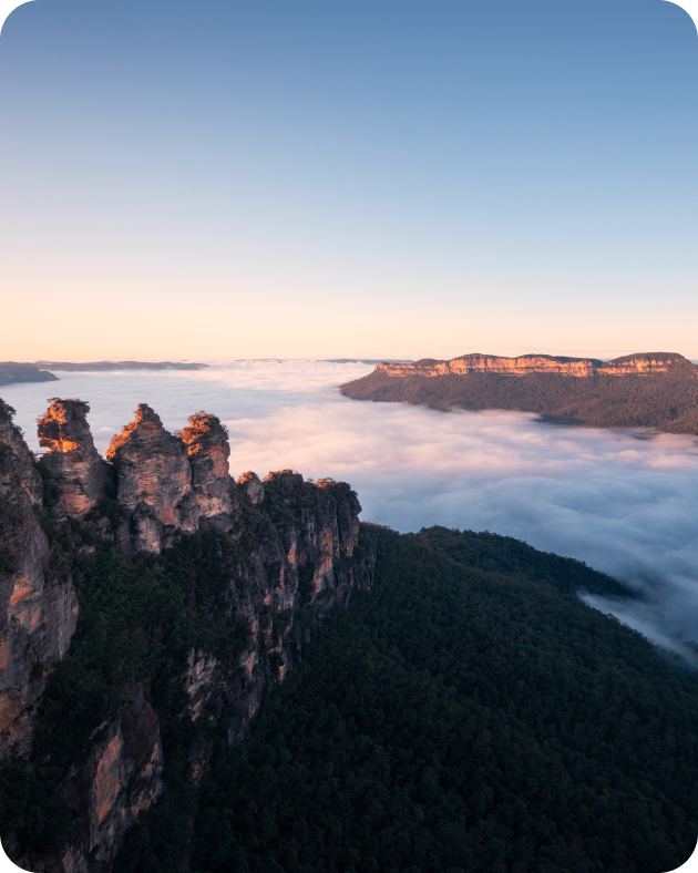 ユーカリから発散される霧状の油分が太陽光に反射して、山々が青く霞んで見えることから、ブルー・マウンテンズと呼ばれる山々。観光のハイライト「スリー・シスターズ」は、エコー・ポイント展望台から眺めるのがおすすめです。床がガラス張りのロープウェイ「スカイウェイ」や世界一の急勾配のトロッコ列車「レイルウェイ」など、乗り物からの眺めも圧巻。自然の雄大さを存分に満喫しましょう。