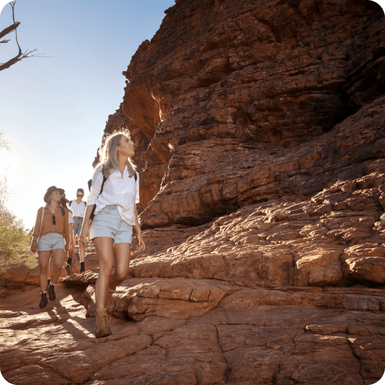 世界有数の大渓谷キングス・キャニオンは、ワタルカ国立公園の一部で、ウルルから車で約3時間の距離にあります。迫力満点の断崖絶壁の景観を楽しめる3時間のリム・ウォークと、キングス・キャニオンの絶壁を下から見上げるのどかな散策路クリークウォークを体力にあわせて選ぶことができます。