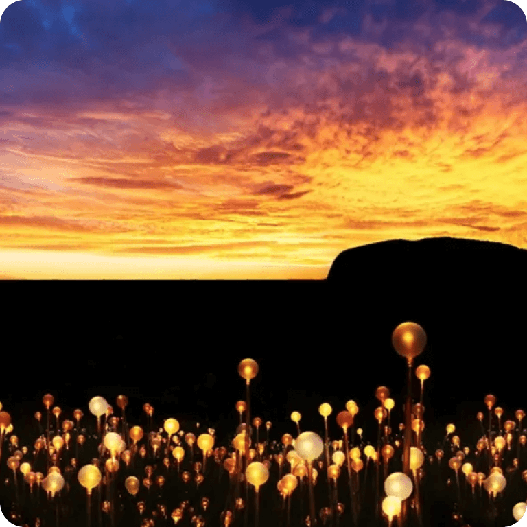 まるでウルルの裾野に咲く花畑のようなアートはブルース・ムンロ氏の作品で、5万個をこえる太陽光発電で光るガラス製のライトが、広大な土地を彩ります。日が沈むとともに浮かび上がる幻想的なイルミネーションはまさに圧巻。鑑賞後、砂漠の真ん中に造られた特設会場で満天の星の下ディナーを味わうプランも人気です。