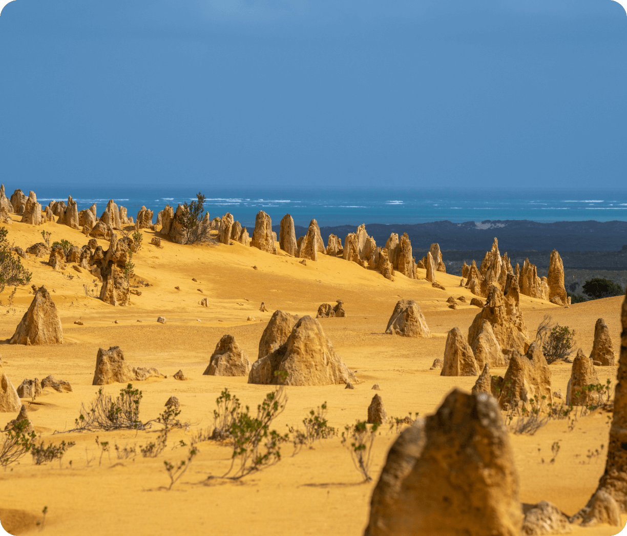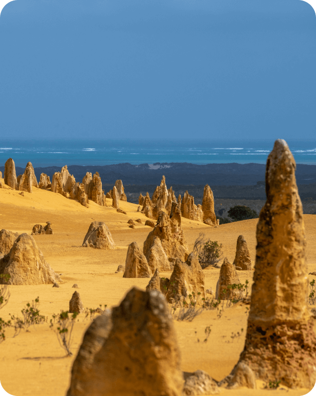 砂漠の中に尖塔のような石灰岩の奇岩がいくつもそびえる神秘的な景観は、まさに自然が作り上げたアート。さらに今も侵食を続け、少しずつ姿を変えています。この非日常的な風景は、日中はもちろん、夕暮れ時や星空の下ではさらに幻想的に。ピナクルズのあるナンバン国立公園へは、西オーストラリアの拠点となるパースから車で約2時間半で行くことができます。