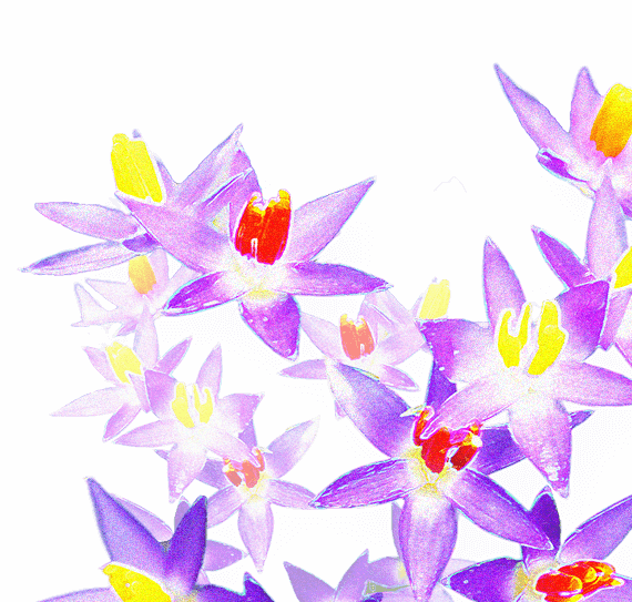©Kyoko Oakley青や薄紫色をした3〜4cmほどの花を咲かせるブルー・ティンセルリリー。黄色のおしべとめしべは時間がたつと赤くなります。