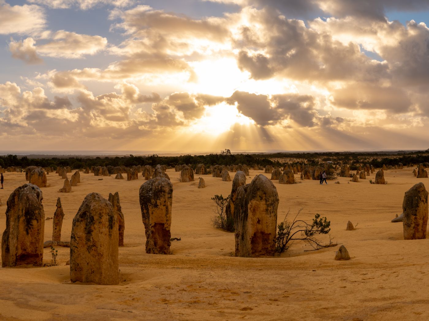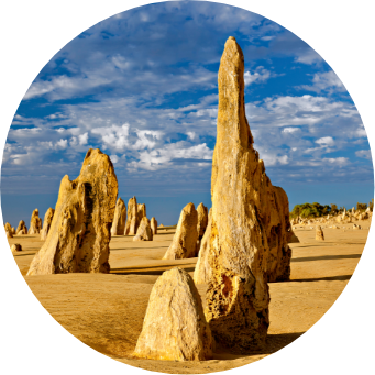 パースから約200km、ナンバン国立公園に広がる独特の景色。「荒野の墓標」と呼ばれる奇岩群ピナクルズがここにあります。もともと海底にあった石灰岩の蓄積が雨風に浸食され、長い歳月をかけて現在の形となりました。そして今なお、姿を変え続けています。大きい奇岩は4m以上の高さがあり、まるで別の惑星に迷い込んだよう。最も幻想的な夕暮れ時や、信じられないほど美しいピナクルズでの星空観賞もおすすめです。