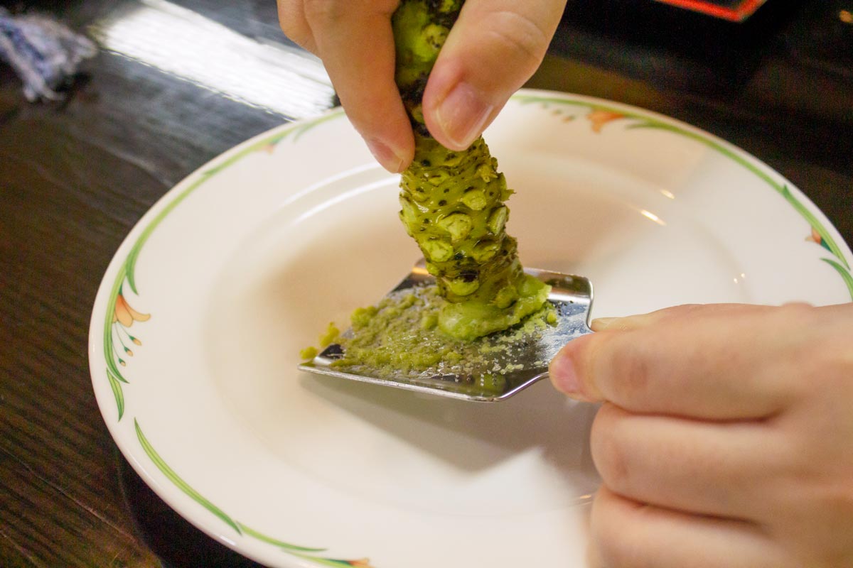 「急斜面に石を積んだ、匹見伝統の”渓流式ワサビ田”を0から作るのはとても難しいけれど、手を入れればまだまだ使えるワサビ田がたくさん残っている。そのような場所を有効活用したい」と考え、取り組みに共感したボランティアの方々の力も借りながら、荒れ果てたワサビ谷を何年もの時間をかけて少しずつ復旧させてきた。限りなく天然に近い自然環境で育った、辛味・甘み・香り・粘りのバランスの良い葵屋のワサビは、時には品切れになるほど高い評価を受けている。