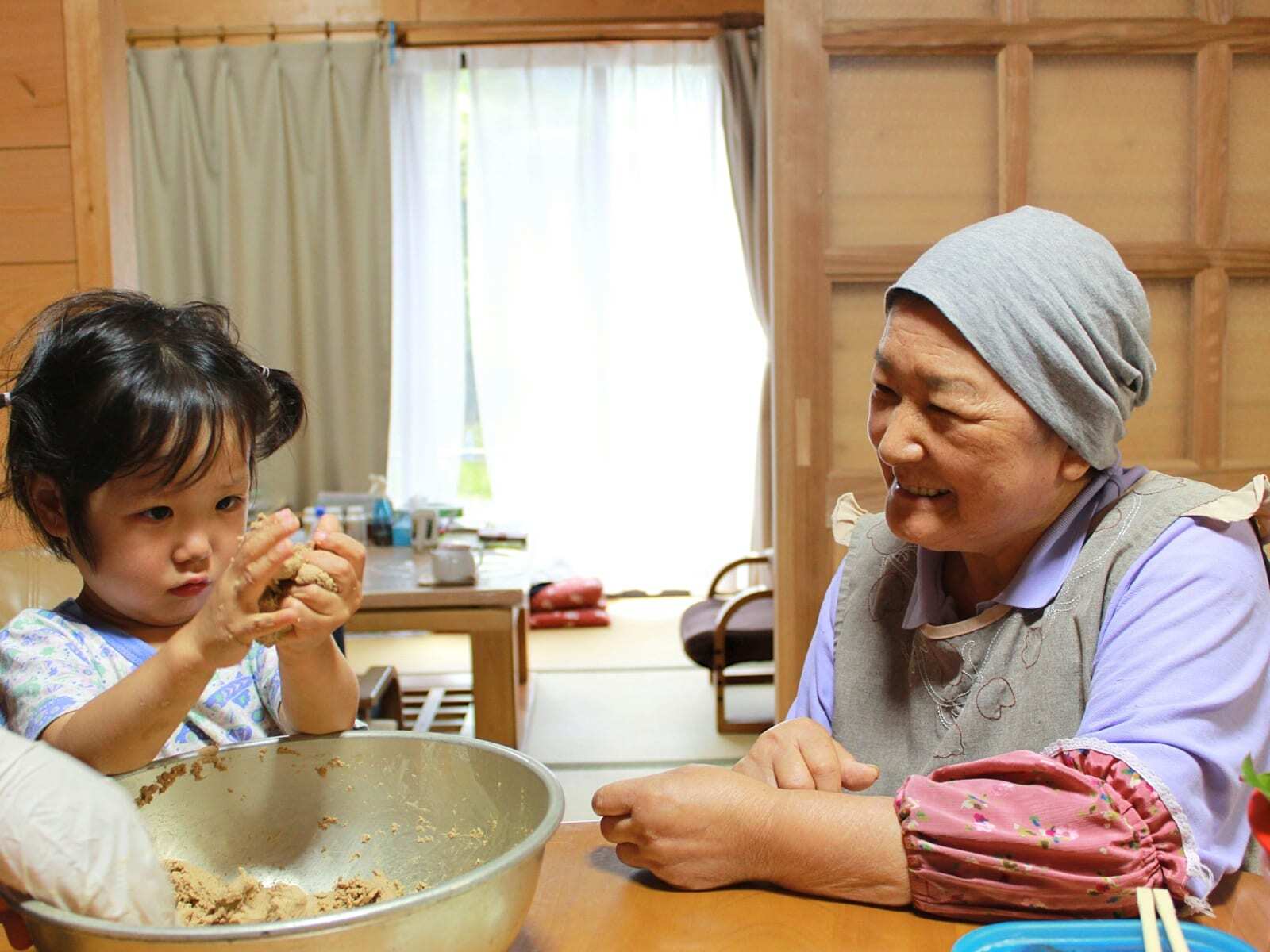 集落の一番奥に、裏山ごと田舎暮らしを体験できる農家民宿があります。囲炉裏、土間に黒電話。タイムスリップしたかのようなお宅でお母さんと作る採れたて野菜やジビエのお食事。ワイルドなおじじと山に入って、木を切り木工体験も。生きる力が育まれる1泊2日の体験です。