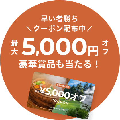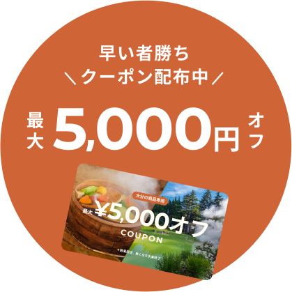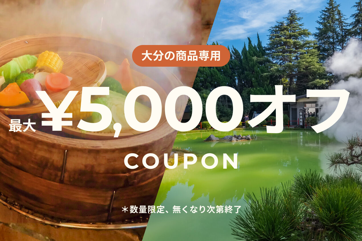 大分県のアクティビティがお得に体験できる、最大¥5,000オフクーポン(¥10,000以上で利用可)を配布中!この機会をお見逃しなく。※¥3,000クーポン(6,000以上で利用可)、¥1,500クーポン(3,000以上で利用可)もございます。