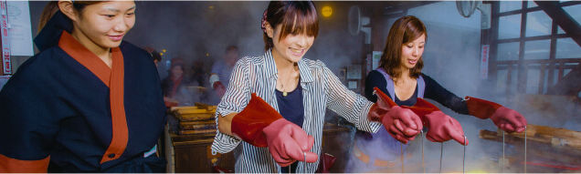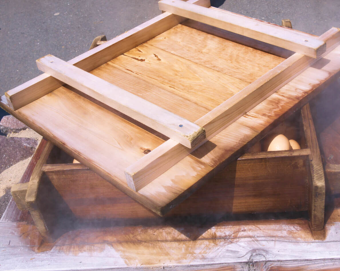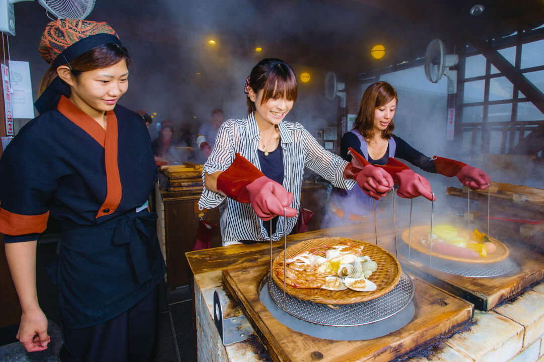 温泉で有名な大分県。街全体に湯気が立ち上る別府市では温泉の蒸気を利用して食材を蒸してできる料理「地獄蒸し」が有名です。調理方法は簡単で肉や海鮮、野菜などの食材を専用のかごに乗せて地獄釜に入れ、蓋をして蒸します。頃合いを見て食材を取り出したら完成。天然温泉に含まれる塩気と、100℃の高温の中蒸されることで旨味が凝縮され、普段の蒸し料理とはまた違った味わいが楽しめます。肉は余分な脂が落とされ野菜などは柔らかく甘くなりお子さまにも食べやすいと評判です!地獄釜は旅館や温泉に設置されているため観光客でも気軽に体験することができます。地元の方は「温泉の帰りに食材を蒸して食べて帰る」という方もいるほど生活に根ざしているのがわかります。好きなものを地獄釜に入れて蒸し上がるのをわくわくしながら待つ時間は、ここならではの体験です!