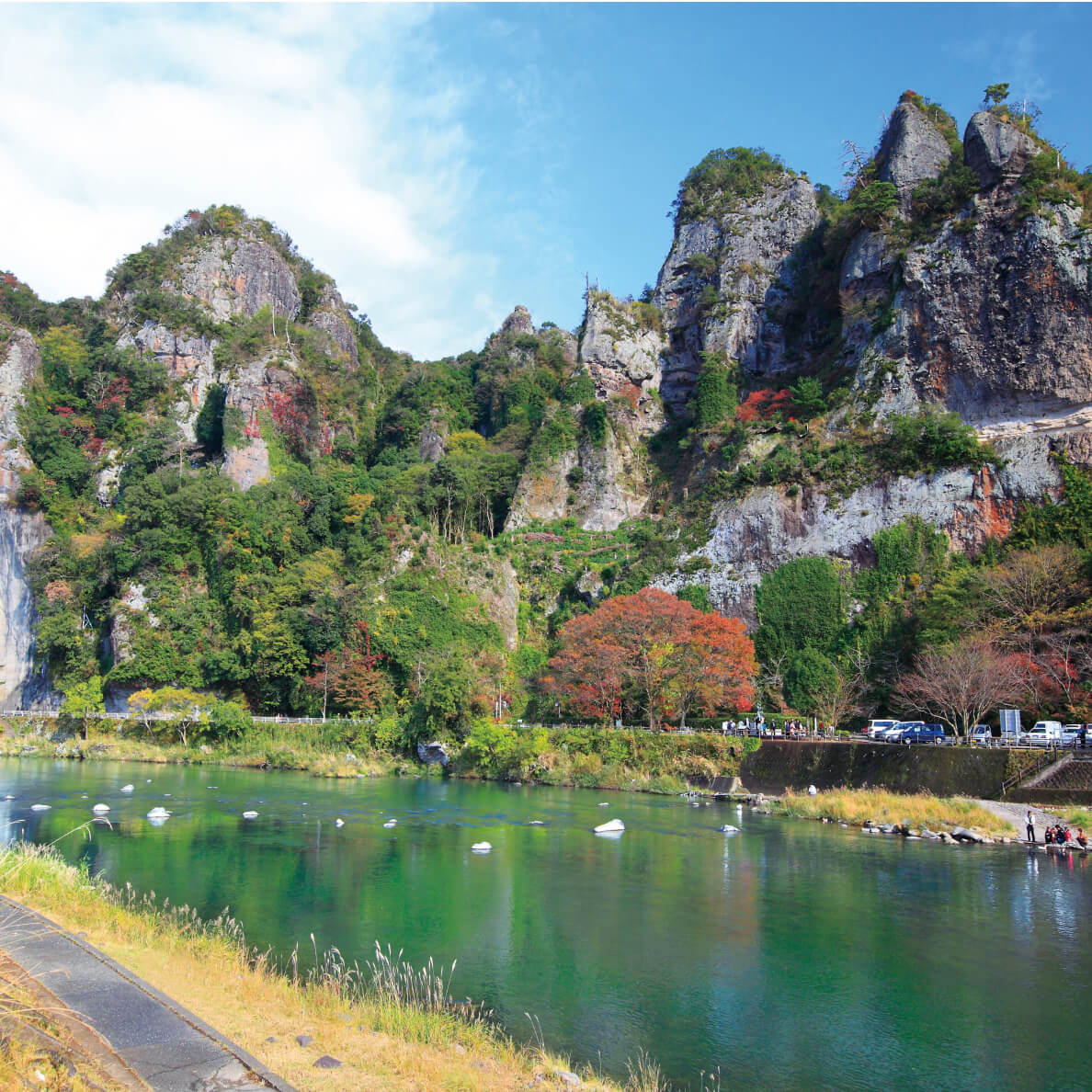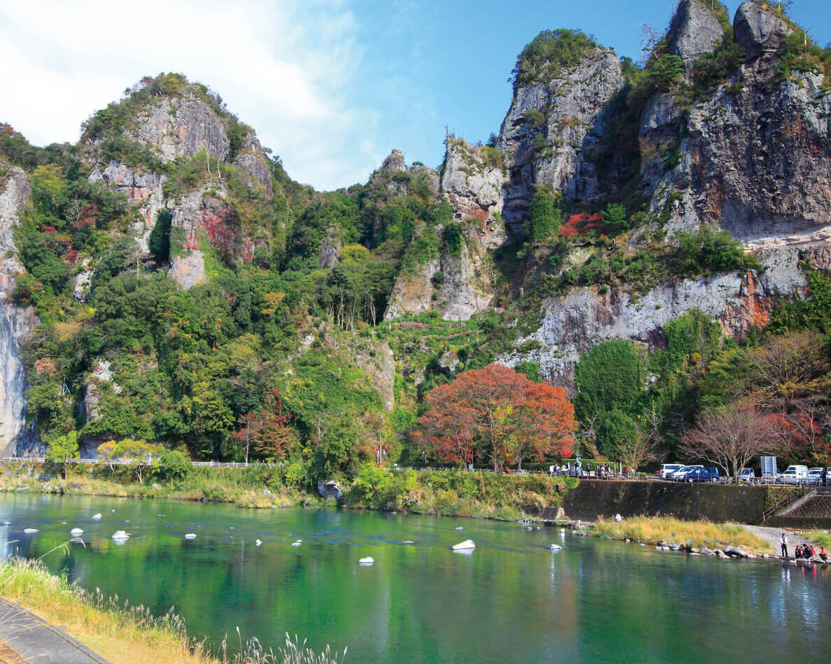 神秘的な地形、奇岩の数々に目を奪われる「耶馬渓」。大分県を代表する景勝地として知られ、四季折々に移りゆく自然やダイナミックな奇峰や渓谷が織りなす景観が楽しめます。一目八景(ひとめはっけい)はダイナミックな岩肌や崖、それを縫うように新緑や紅葉が覗き、まるで大地に包まれるような感覚に浸ることができます。大分県で人気の紅葉スポットであり、念仏橋や青の洞門なども圧巻です。