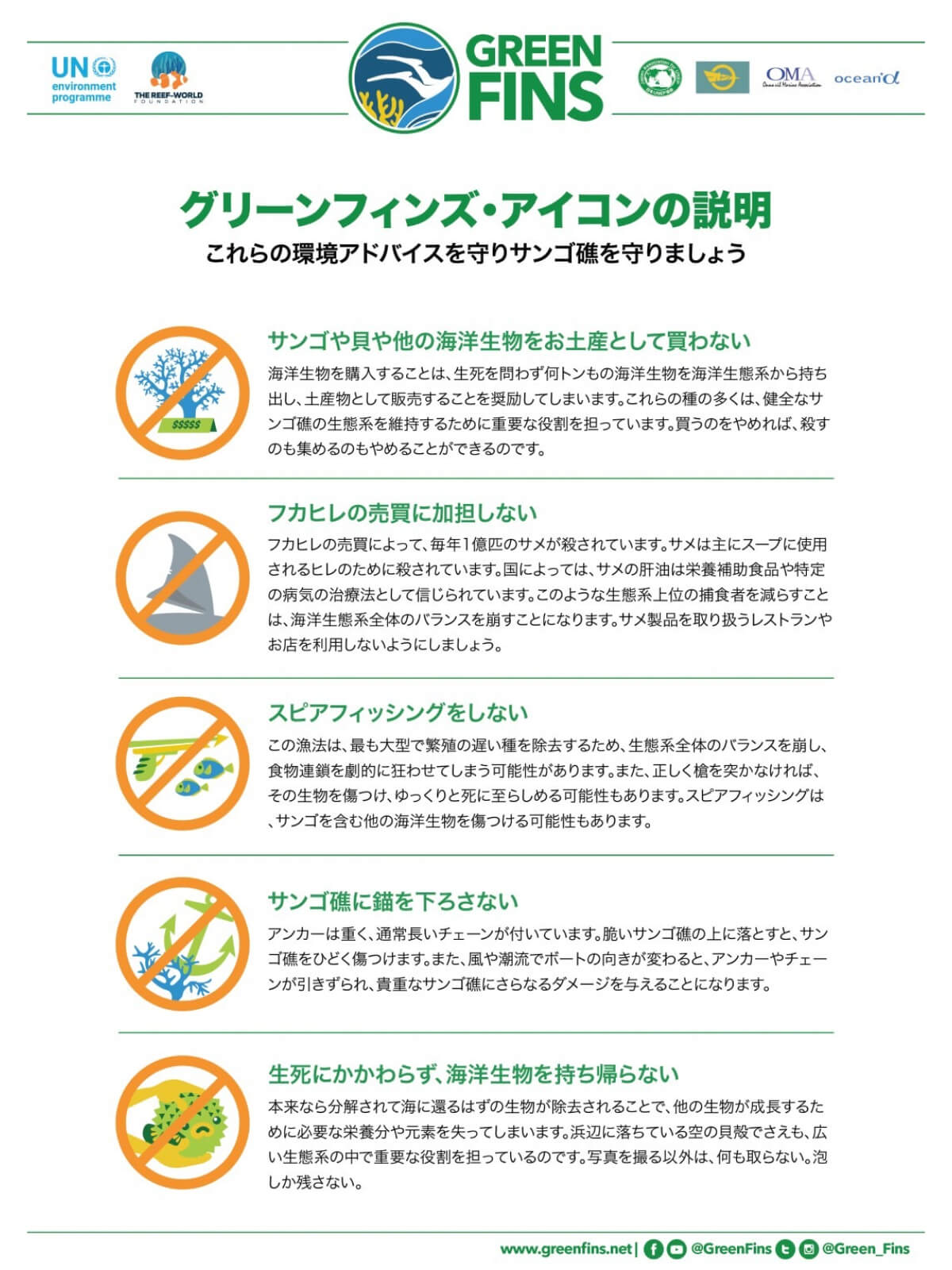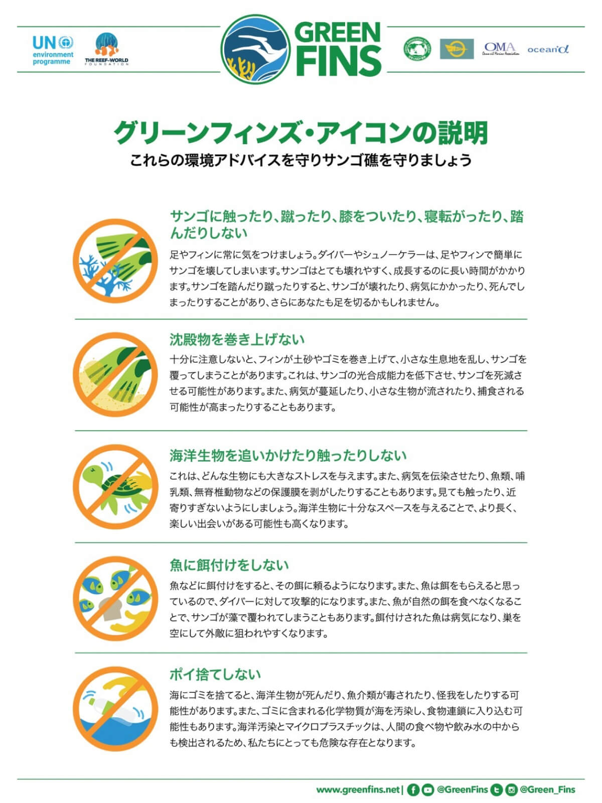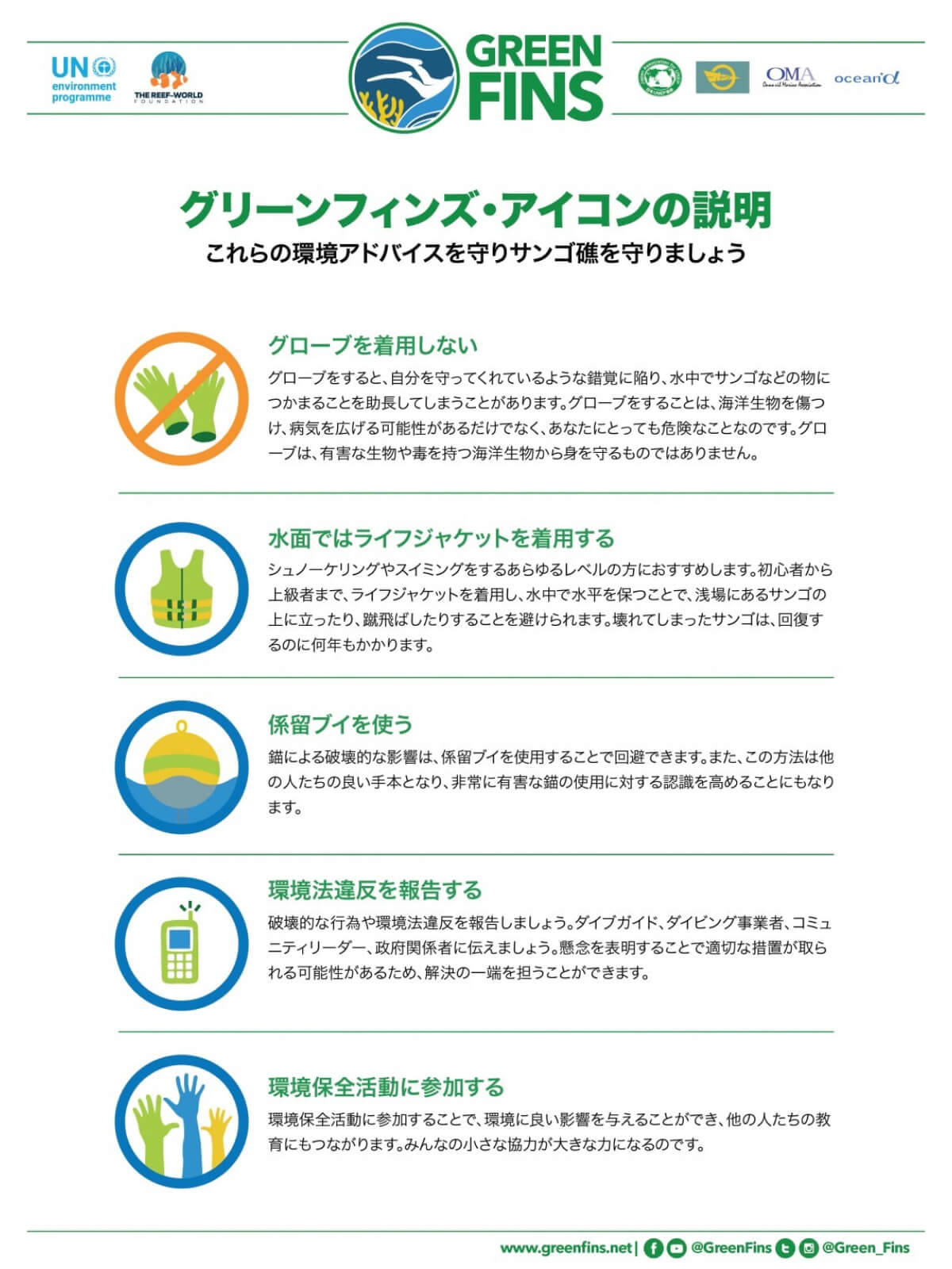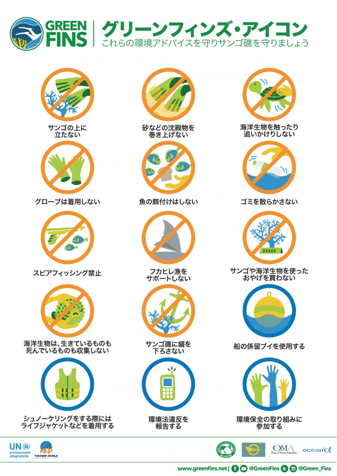 「Green Fins(グリーン・フィンズ)」は、環境にやさしく持続可能なダイビング・シュノーケリングのガイドラインで、UNEP(国連環境計画)とイギリスのReef World財団により制定されました。